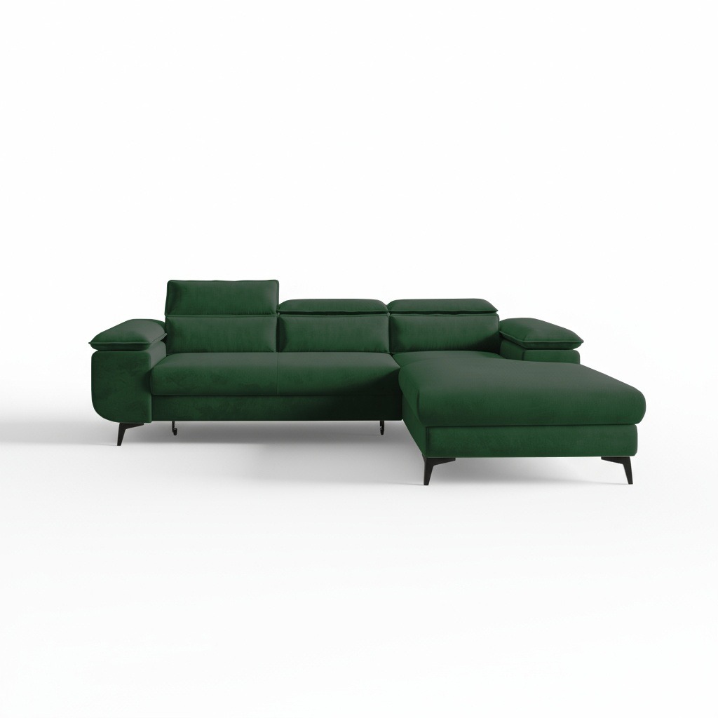 Jego przemyślany kształt litery L tworzy przytulną strefę wypoczynku w sercu salonu. Głęboka, butelkowa zieleń nadaje wnętrzu atmosferę spokoju i elegancji. Dlatego ten odcień doskonale współgra z naturalnym drewnem, złotem oraz czarnymi akcentami. Wysokie, czarne nóżki z metalu nadają całej bryle lekkości i nowoczesnego charakteru. Co ważne, tapicerowany tył mebla pozwala na dowolne ustawienie go w pokoju, nawet na środku.
