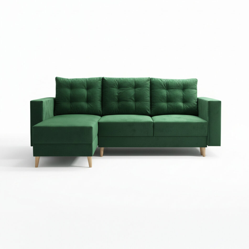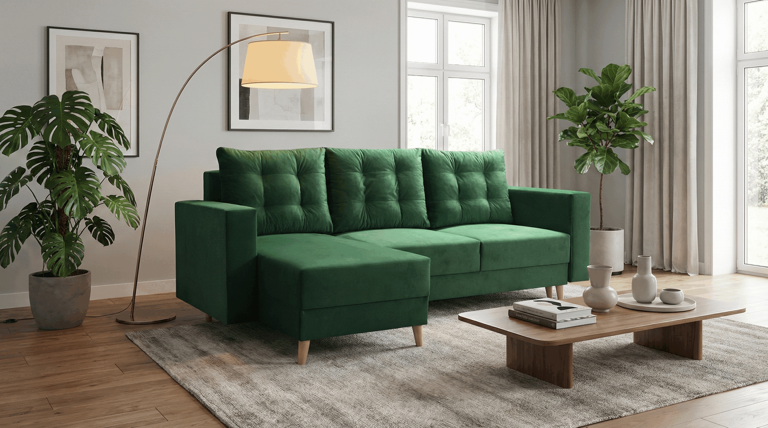 Model w kształcie litery L doskonale wpisuje się w aranżacje skandynawskie oraz klasyczne. Wysokie nóżki z naturalnego drewna bukowego dodają całej konstrukcji wizualnej lekkości. Kolor butelkowej zieleni wprowadza do salonu atmosferę spokoju i głębi. Dlatego wnętrze staje się przytulną oazą, idealną do wyciszenia po długim dniu. Co ważne, tapicerowany tył mebla pozwala na swobodne ustawienie go w centralnym punkcie pokoju.