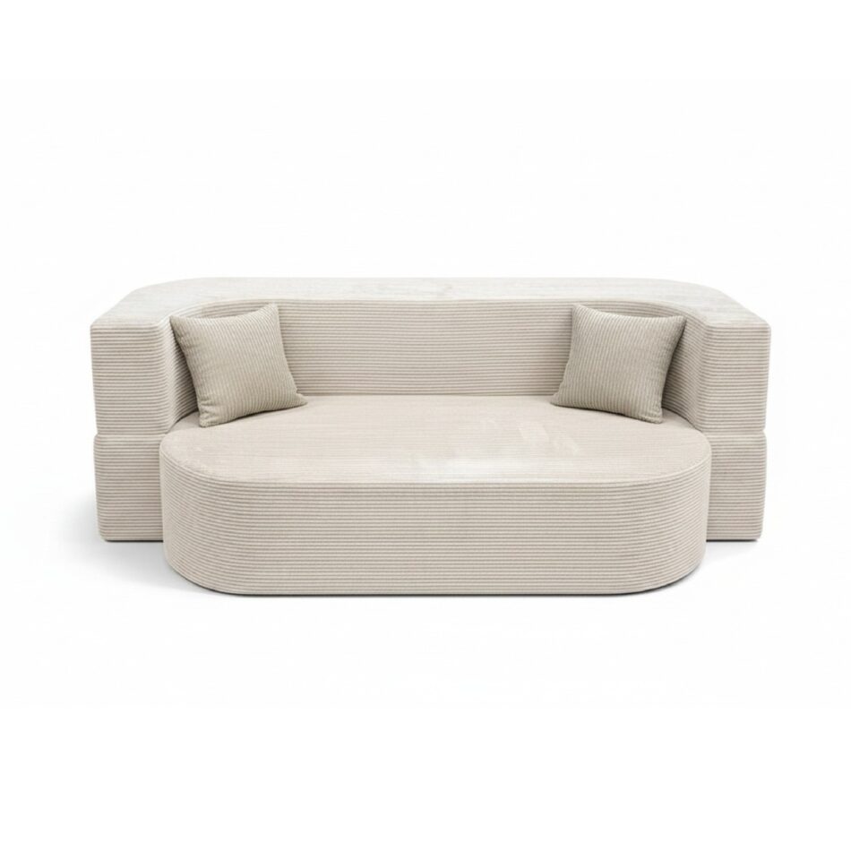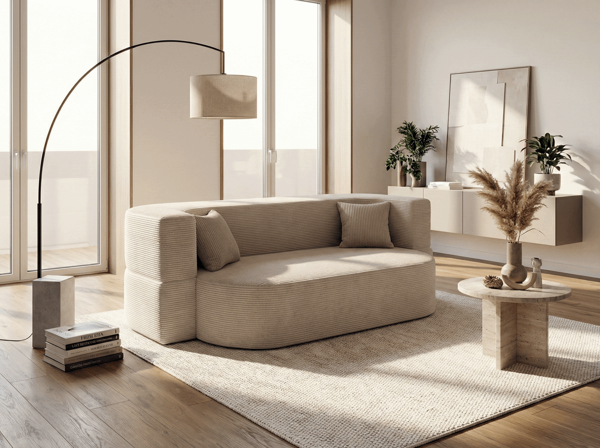 Miękka, obła bryła nadaje sofie przytulny, współczesny charakter i sprawia, że staje się ona naturalnym elementem strefy wypoczynku. Tapicerka z sztruksowej tkaniny o wyraźnej strukturze podkreśla nowoczesny design, jednocześnie wprowadzając do wnętrza ciepło i przyjemną w dotyku fakturę.