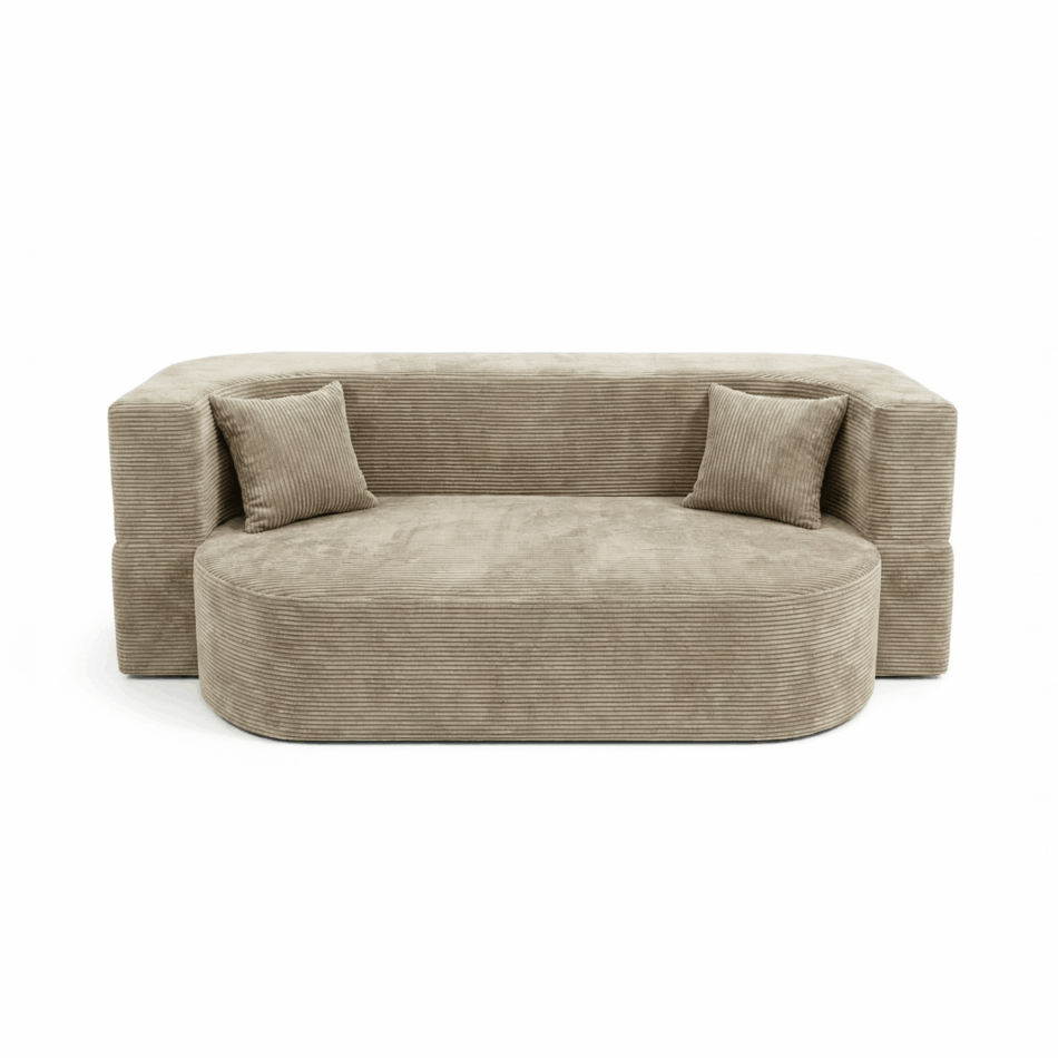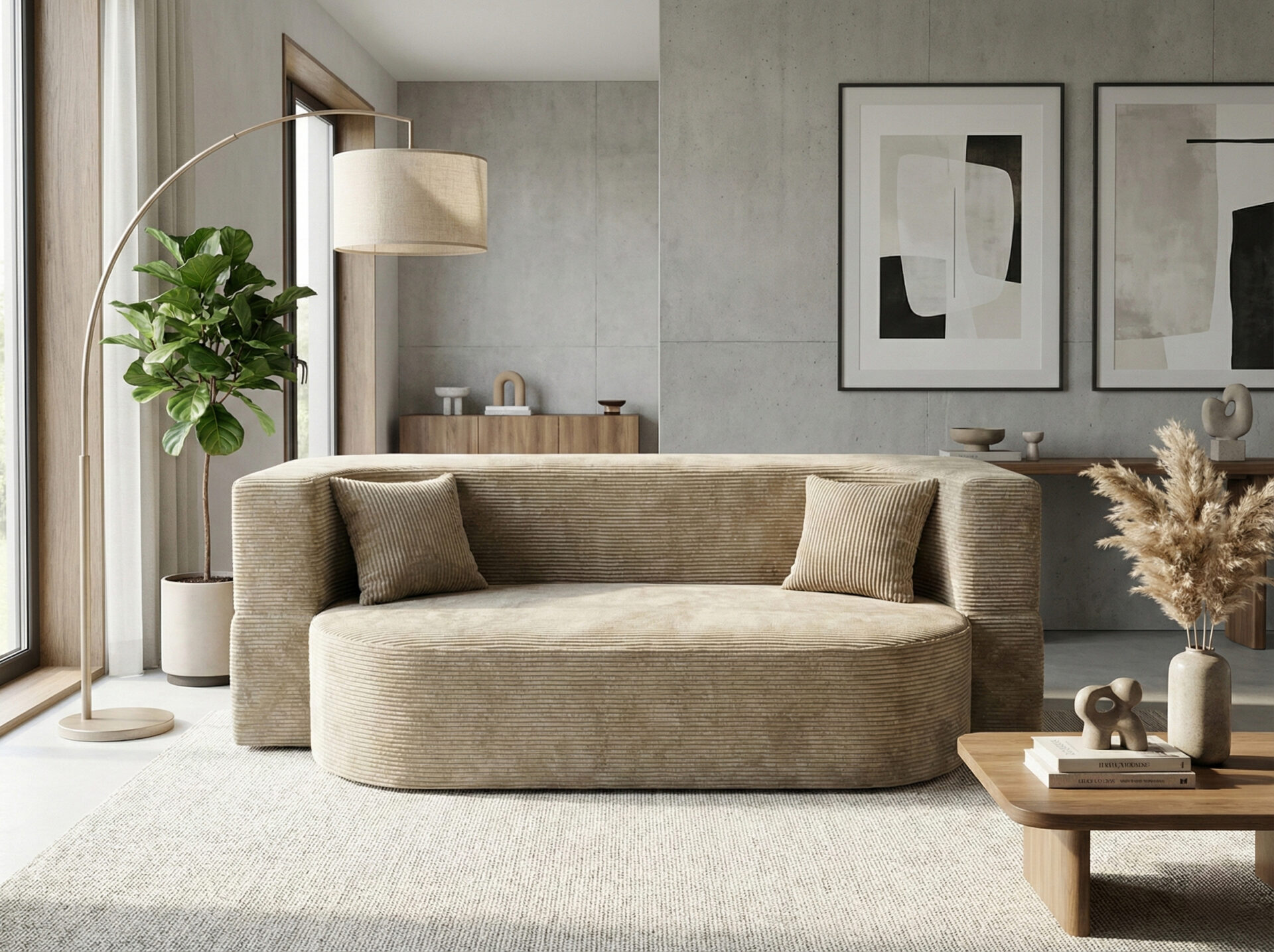 Sofa Ova oferuje również możliwość komfortowego wypoczynku w pozycji leżącej, zachowując jednolitą, minimalistyczną formę bez mechanizmów i podziałów. Sztruksowa tapicerka nadaje wnętrzu ciepła i podkreśla nowoczesny charakter mebla.