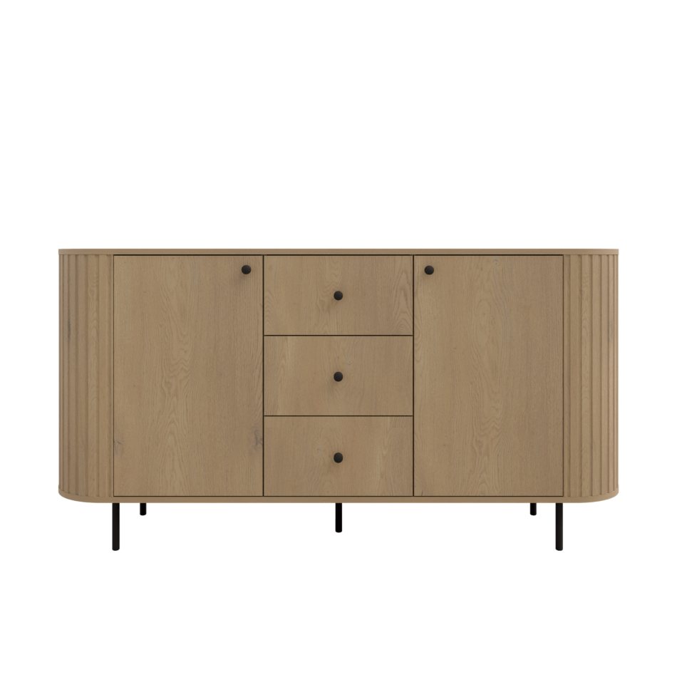 Komoda Ovalio dąb Cremona z 2 szafkami i 3 szufladami to nowoczesny i praktyczny mebel, który wprowadza porządek, styl i komfort użytkowania do każdego wnętrza. Idealna do aranżacji nowoczesnych, eleganckich i przytulnych przestrzeni.
