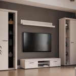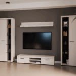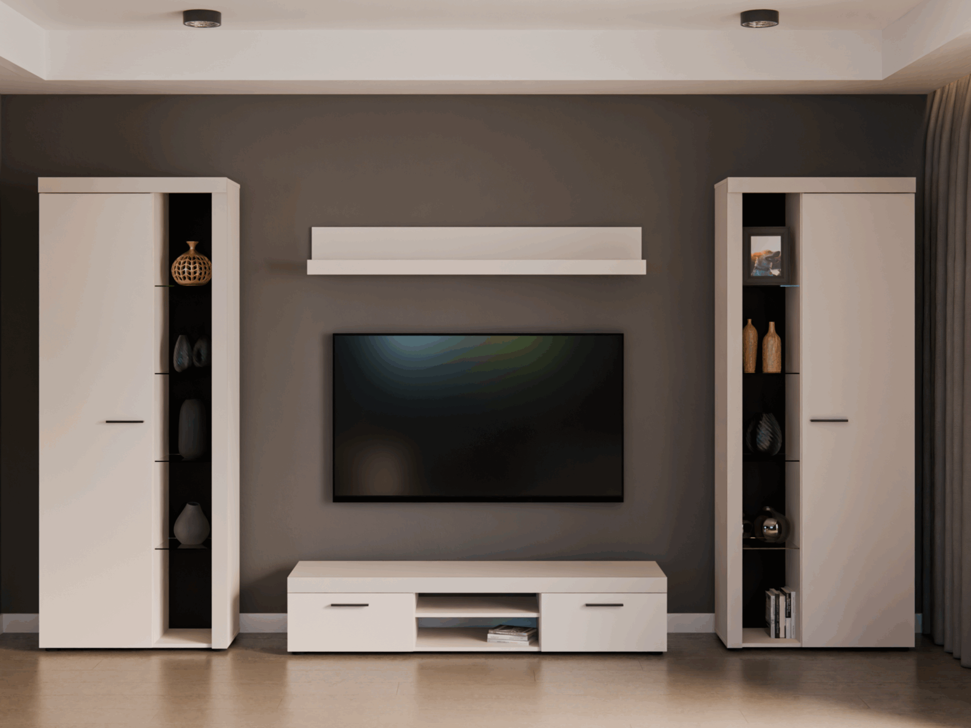 Meblościanka została zaprojektowana z myślą o maksymalnym wykorzystaniu przestrzeni. Posiada miejsce na telewizor, otoczone praktycznymi szafkami i półkami, które pozwalają na przechowywanie książek, dekoracji, elektroniki oraz innych przedmiotów codziennego użytku.