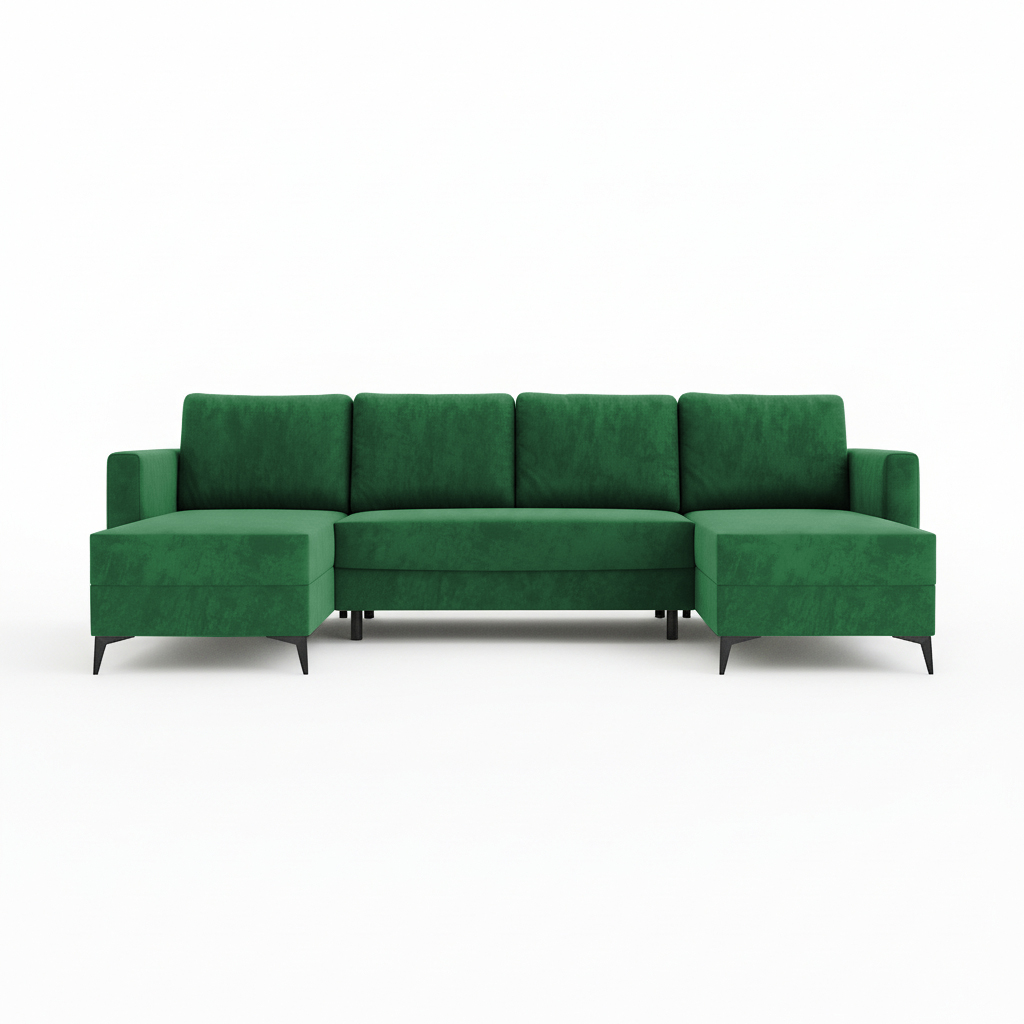 Jego symetryczna forma w kształcie litery U tworzy idealne miejsce do spotkań w większym gronie. Głęboki, butelkowy odcień zieleni nadaje wnętrzu szlachetności i spokoju. Dlatego świetnie odnajduje się zarówno w nowoczesnych, jak i klasycznych aranżacjach. Wysokie, czarne nóżki dodają całej bryle wizualnej lekkości. Co ważne, tapicerowany tył pozwala na ustawienie mebla w dowolnym miejscu salonu, nie tylko przy ścianie.