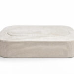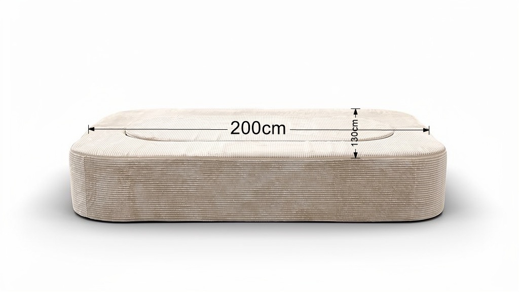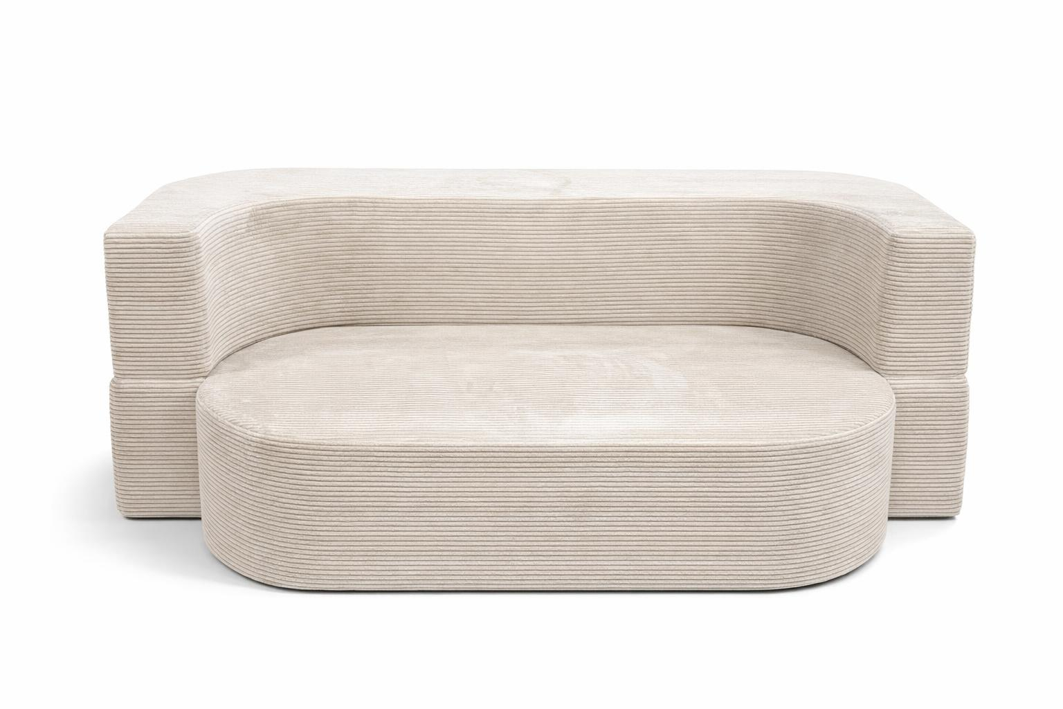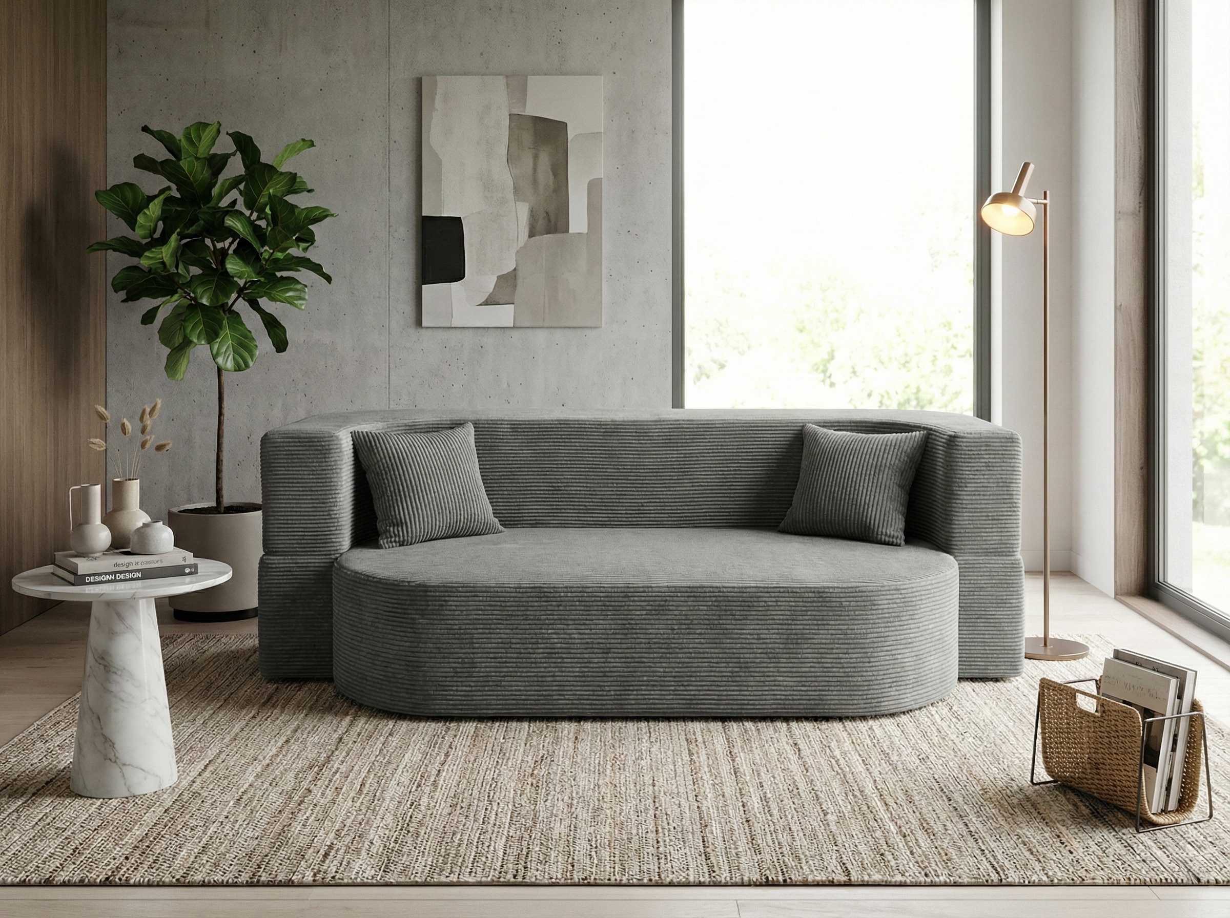 Sofa Ova oferuje również możliwość komfortowego wypoczynku w pozycji leżącej, zachowując jednolitą, minimalistyczną formę bez mechanizmów i podziałów. Sztruksowa tapicerka nadaje wnętrzu ciepła i podkreśla nowoczesny charakter mebla.