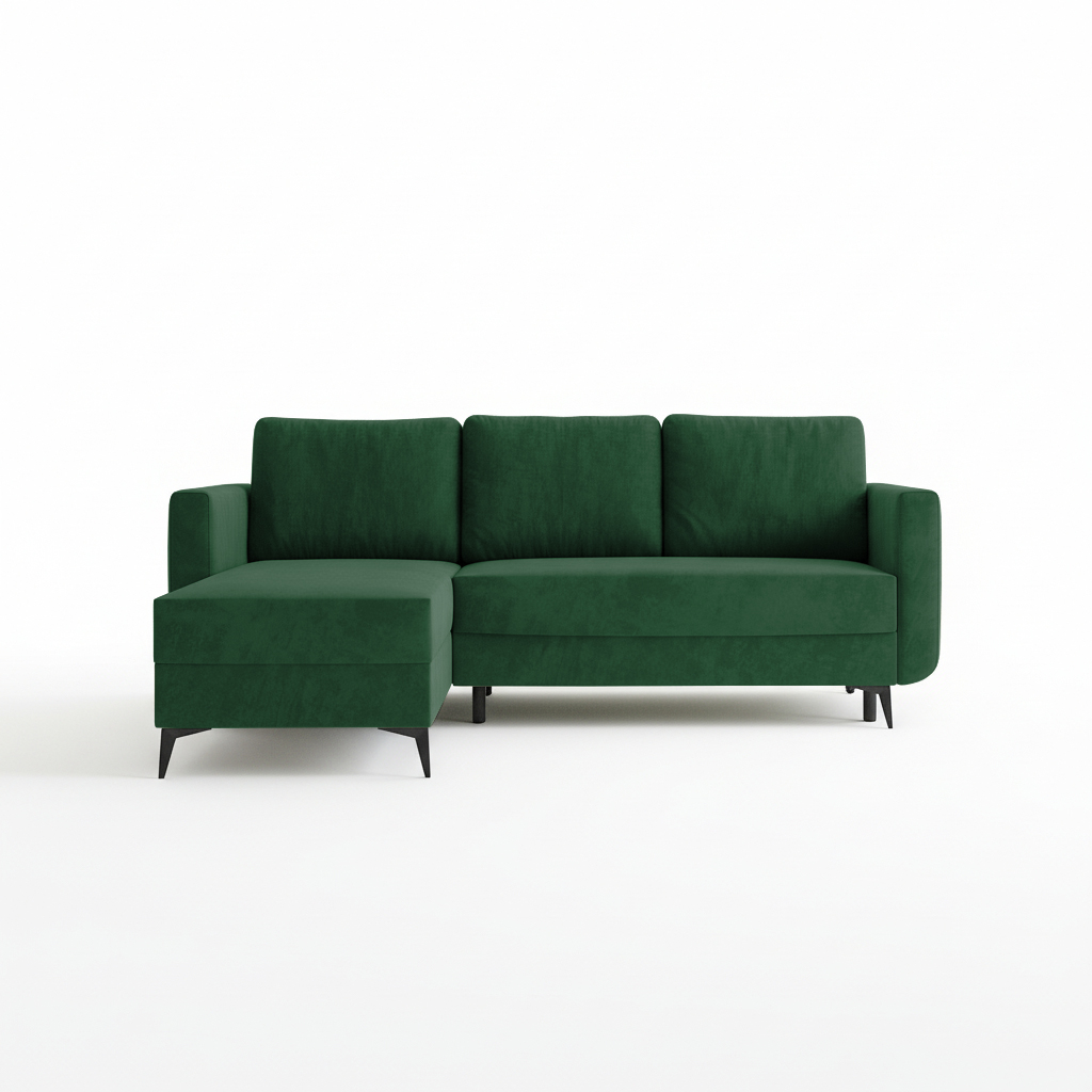 Jego sylwetka w kształcie litery L doskonale odnajduje się w różnych aranżacjach. Pasuje zarówno do wnętrz nowoczesnych, jak i tych inspirowanych klasyką. Szlachetny odcień butelkowej zieleni nadaje salonowi głębi i przytulnego charakteru. Tworzy atmosferę sprzyjającą wyciszeniu. Wysokie, czarne nóżki dodają konstrukcji wizualnej lekkości. Co ważne, tapicerowany tył pozwala ustawić mebel w dowolnym miejscu pokoju.