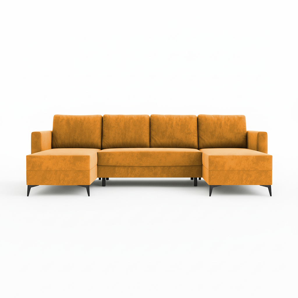 Jego symetryczny kształt w literę U naturalnie tworzy w salonie przestrzeń do spotkań. Model ten z łatwością staje się centralnym punktem aranżacji. Wysokie, czarne nóżki dodają konstrukcji wizualnej lekkości. Tapicerowany tył pozwala z kolei na ustawienie mebla w dowolnym miejscu pokoju.