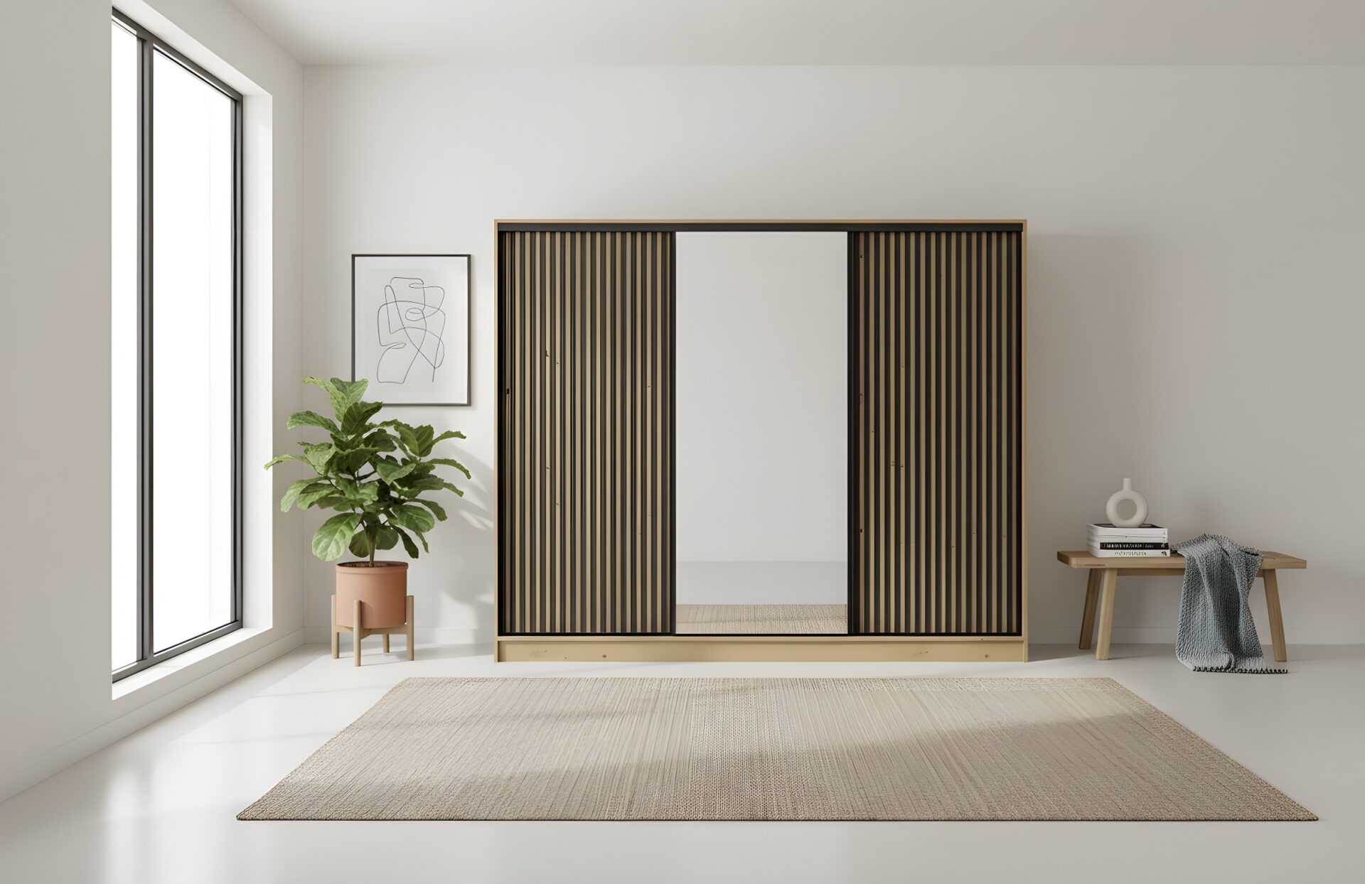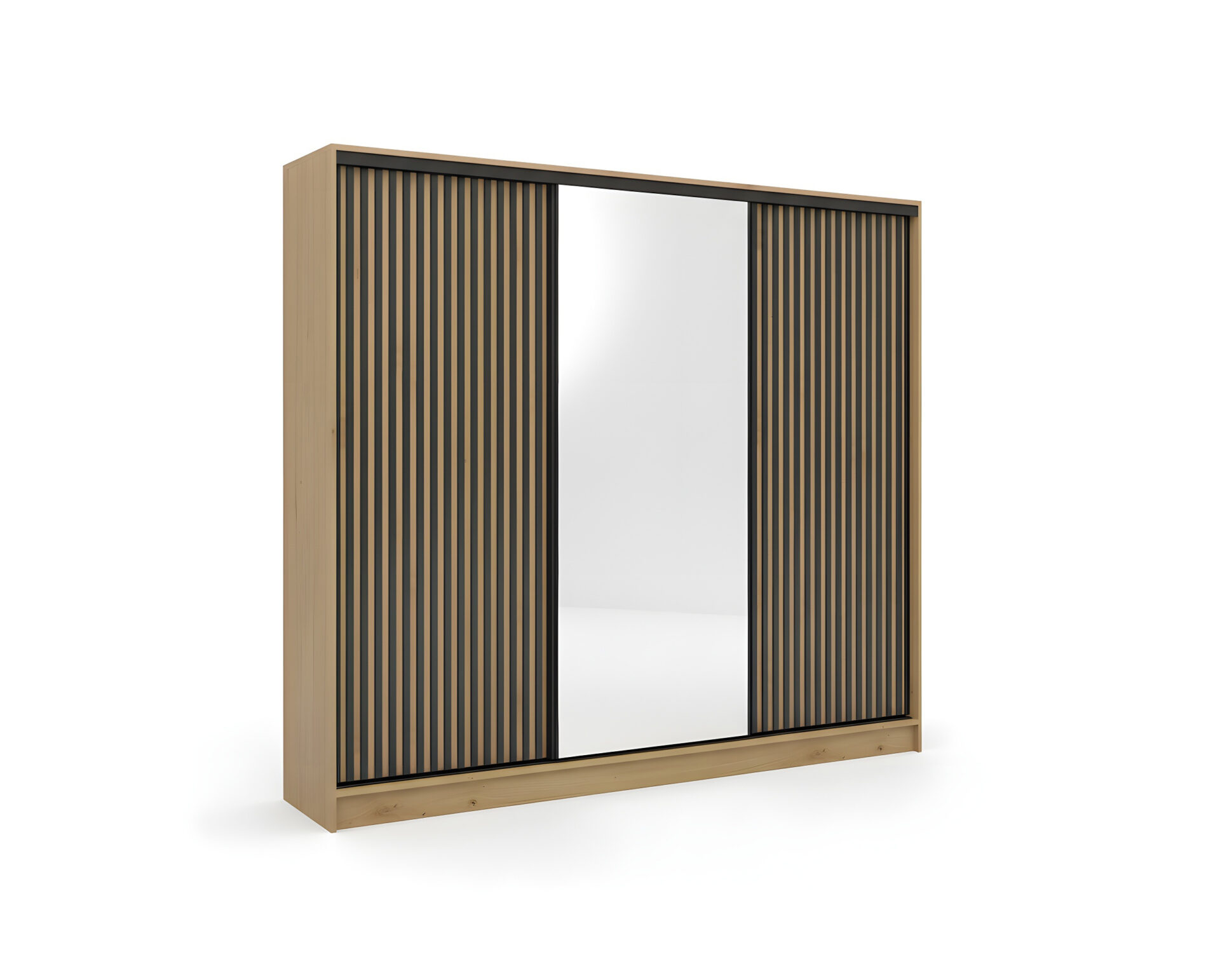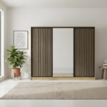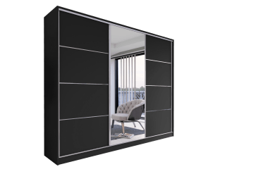 Szafa Nubi to efektowny i pojemny mebel do nowoczesnych wnętrz. Jej charakterystyczną cechą są dekoracyjne lamele w kolorze czarnym, umieszczone po bokach frontu, które nadają całości elegancki, a zarazem modny wygląd. Centralne lustro pełni funkcję praktyczną i wizualnie powiększa przestrzeń, wprowadzając do wnętrza więcej światła.