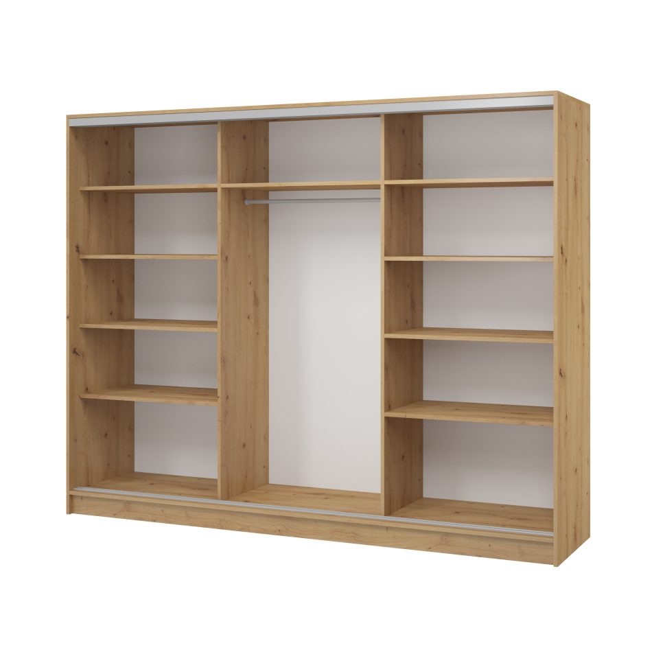 System drzwi przesuwnych zapewnia wygodne użytkowanie, a duża szerokość – aż 200 cm – pozwala na przechowywanie bardzo dużej ilości ubrań i akcesoriów. Wnętrze szafy kryje w sobie praktyczne półki oraz drążek na ubrania, co ułatwia utrzymanie porządku.
