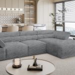 Jego nowoczesna sylwetka została osadzona na niskich, czarnych nóżkach, które dodają jej lekkości. Szlachetny szary kolor tapicerki tworzy spokojną i elegancką bazę dla całej aranżacji. Dzięki temu mebel doskonale odnajduje się we wnętrzach nowoczesnych oraz tych inspirowanych stylem boho. W pełni tapicerowany tył pozwala z kolei na swobodne ustawienie narożnika w centralnym punkcie salonu.