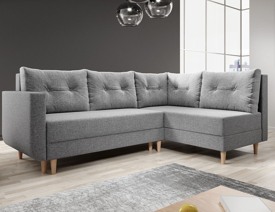 Jego ponadczasowy design z łatwością dopasuje się do wielu aranżacji. Stanowi doskonałą bazę dla wnętrz w stylu skandynawskim lub nowoczesnym. Jasnoszara tapicerka wprowadza do salonu atmosferę spokoju oraz lekkości. Dzięki niej pomieszczenie staje się optycznie większe i jaśniejsze. Całość spoczywa na wysokich, drewnianych nóżkach w kolorze buku. W ten sposób masywna bryła nabiera wizualnej finezji. Co ważne, tapicerowany tył pozwala na ustawienie mebla w dowolnym miejscu, nawet na środku pokoju.