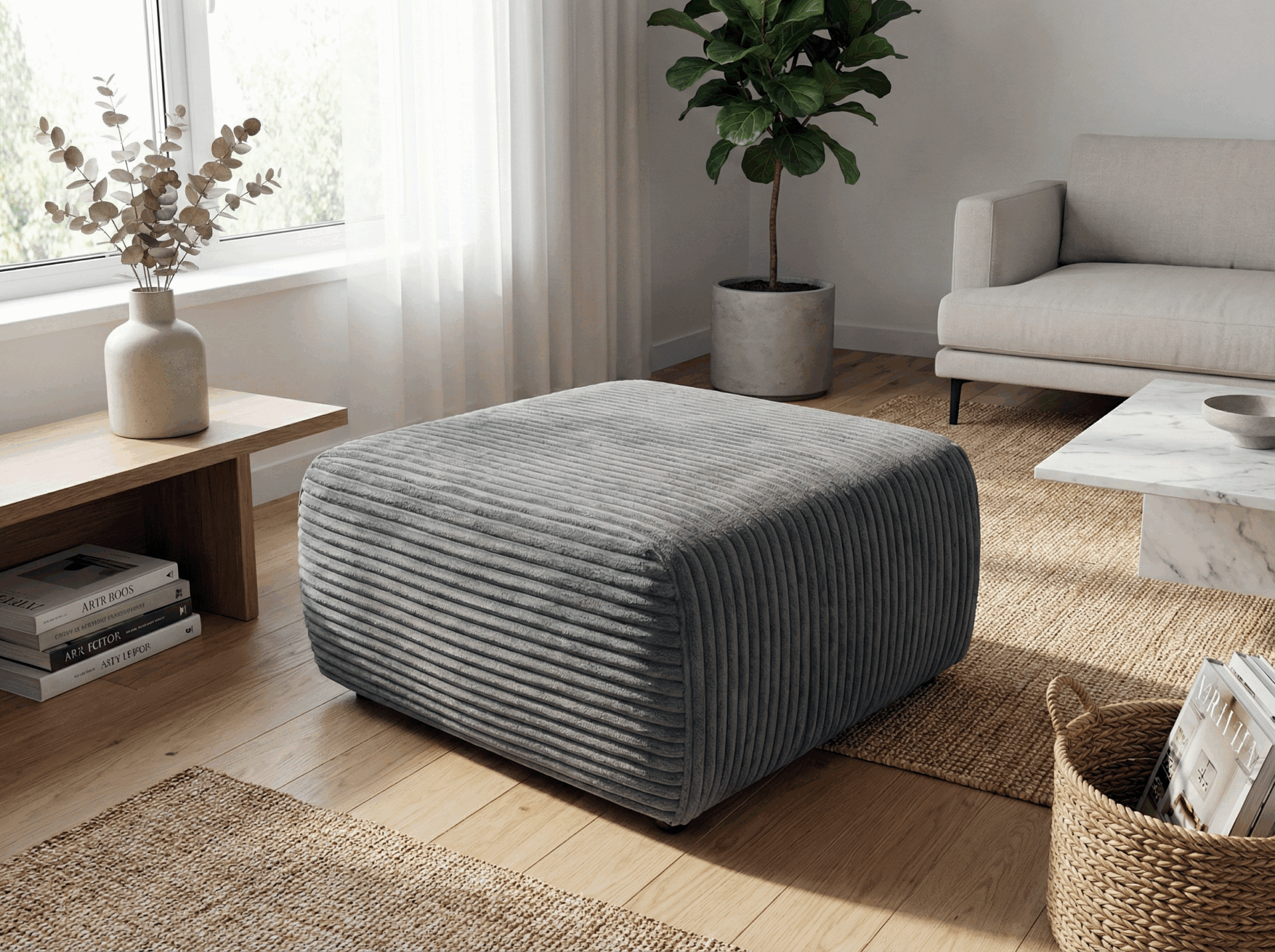 Pufa Nesso obita jest miękką i przyjemną w dotyku tkaniną sztruksową, której wyraźna struktura nadaje całości nowoczesnego, a zarazem ciepłego charakteru. Sztruks podkreśla minimalistyczny design pufy i świetnie komponuje się z narożnikami z kolekcji Nesso.