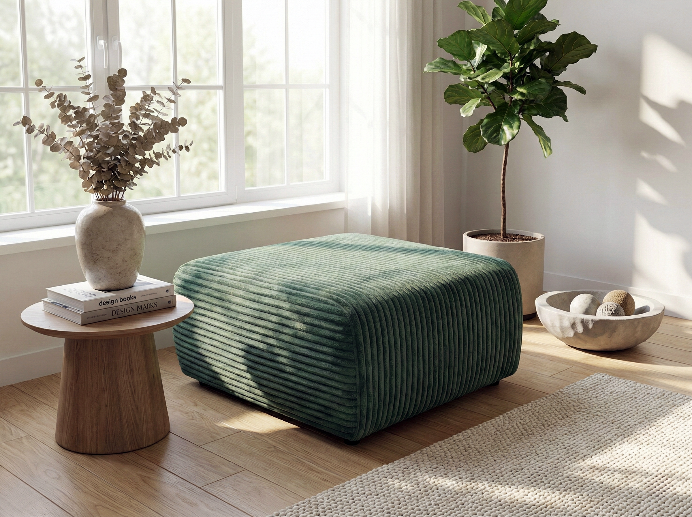 Pufa Nesso obita jest miękką i przyjemną w dotyku tkaniną sztruksową, której wyraźna struktura nadaje całości nowoczesnego, a zarazem ciepłego charakteru. Sztruks podkreśla minimalistyczny design pufy i świetnie komponuje się z narożnikami z kolekcji Nesso.