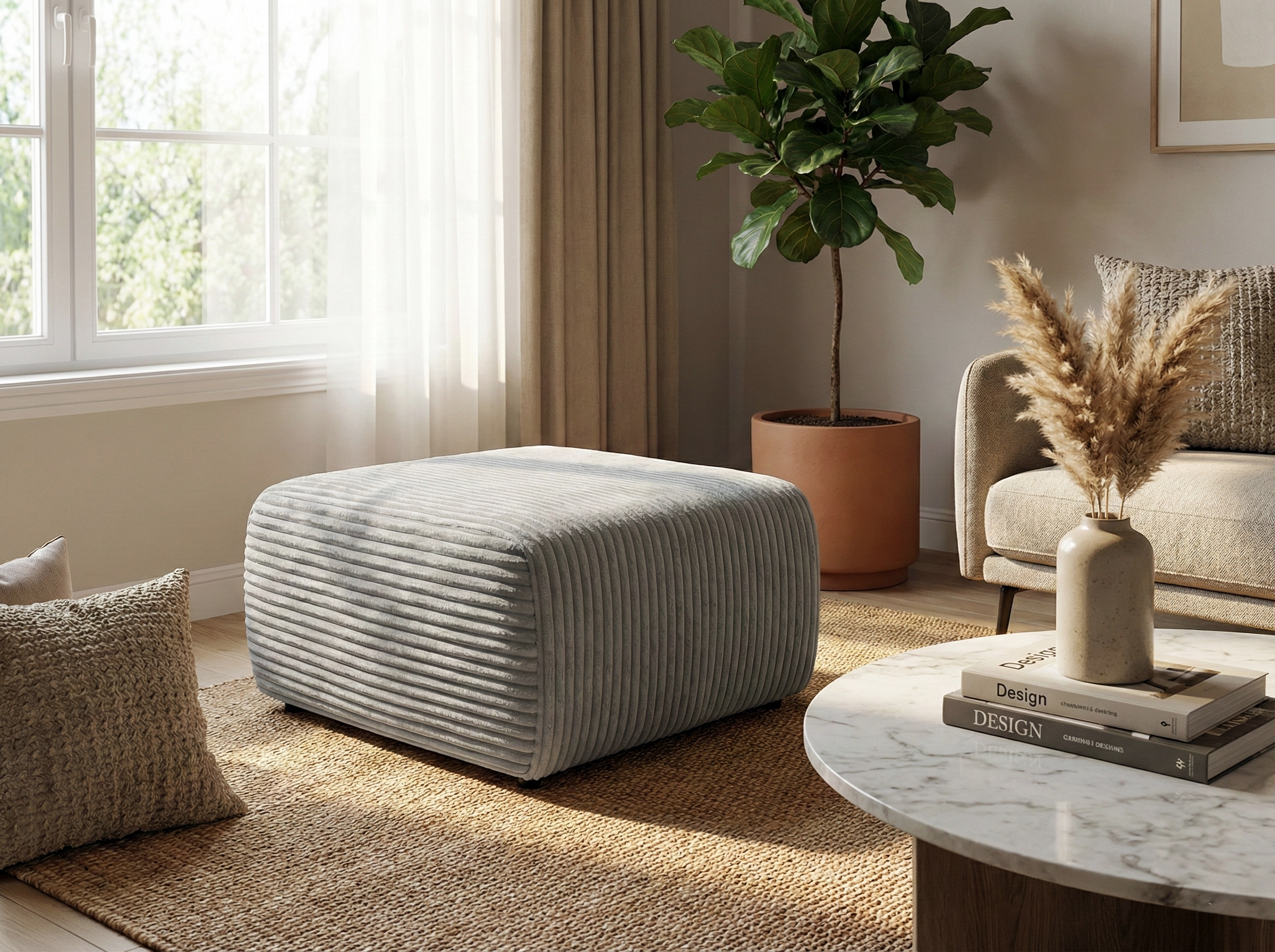 Pufa Nesso obita jest miękką i przyjemną w dotyku tkaniną sztruksową, której wyraźna struktura nadaje całości nowoczesnego, a zarazem ciepłego charakteru. Sztruks podkreśla minimalistyczny design pufy i świetnie komponuje się z narożnikami z kolekcji Nesso.
