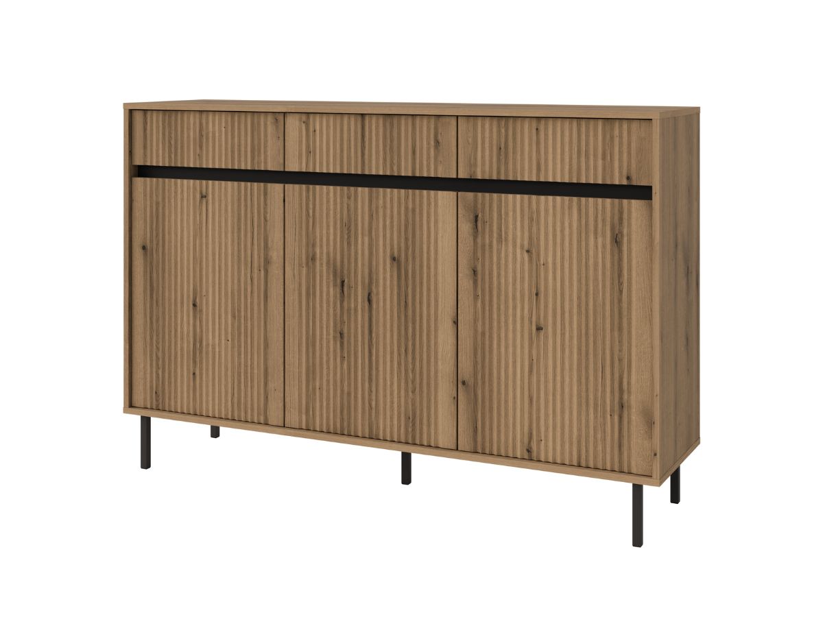 Trzydrzwiowa komoda Osaka to połączenie nowoczesnego designu z wysoką funkcjonalnością, idealne do każdego wnętrza. Komoda wyróżnia się ryflowanymi frontami, które nadają jej unikalnego charakteru i wprowadzają elegancję do przestrzeni.