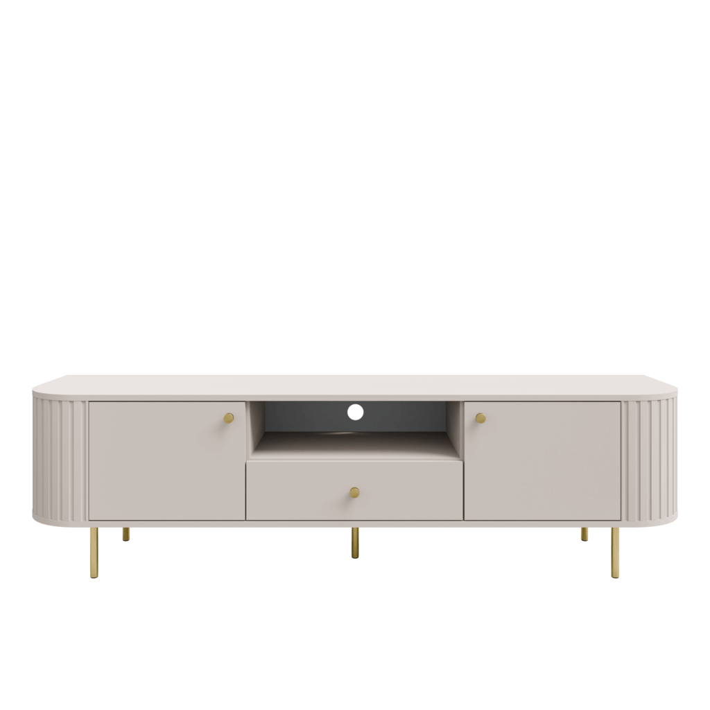 Duża szafka RTV Ovalio beż piaskowy z 2 szafkami, 1 szufladą i półką na dekoracje na wysokich czarnych nóżkach to elegancki, nowoczesny i praktyczny mebel, który wprowadza styl, porządek i komfort do każdego wnętrza.