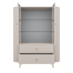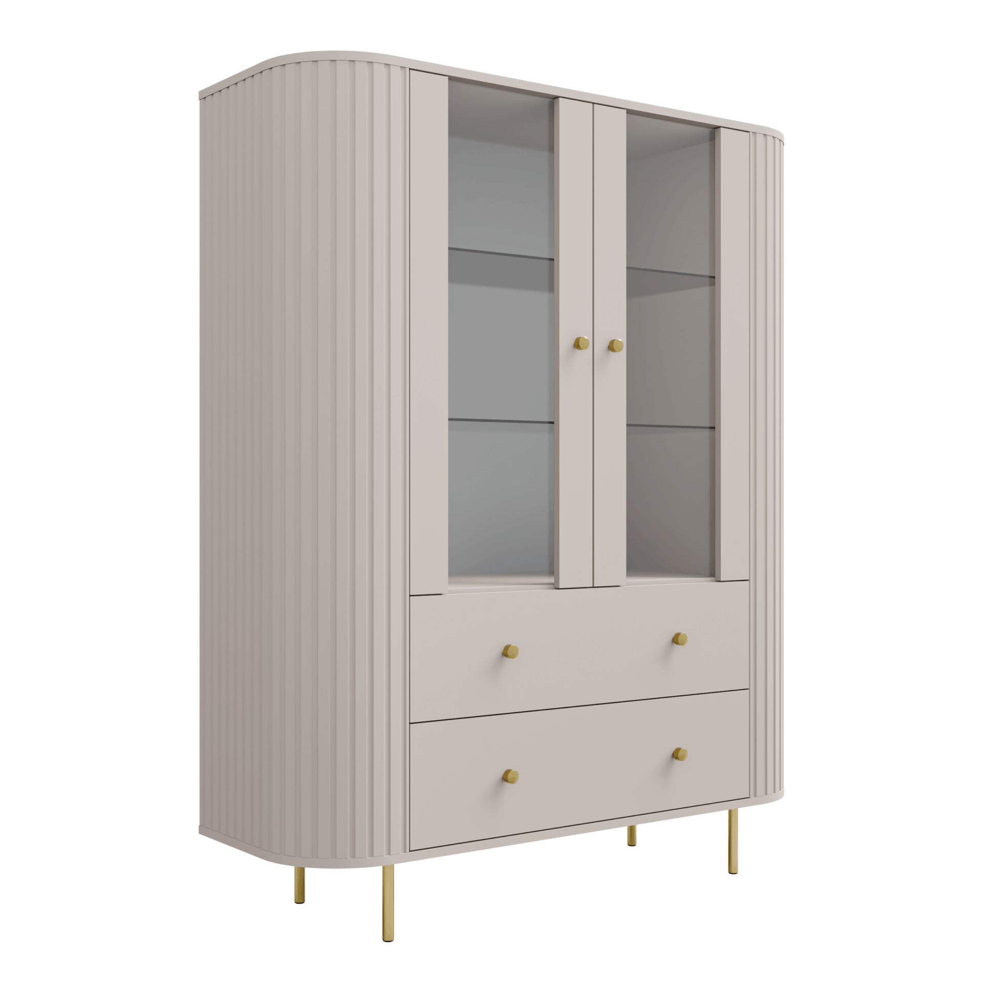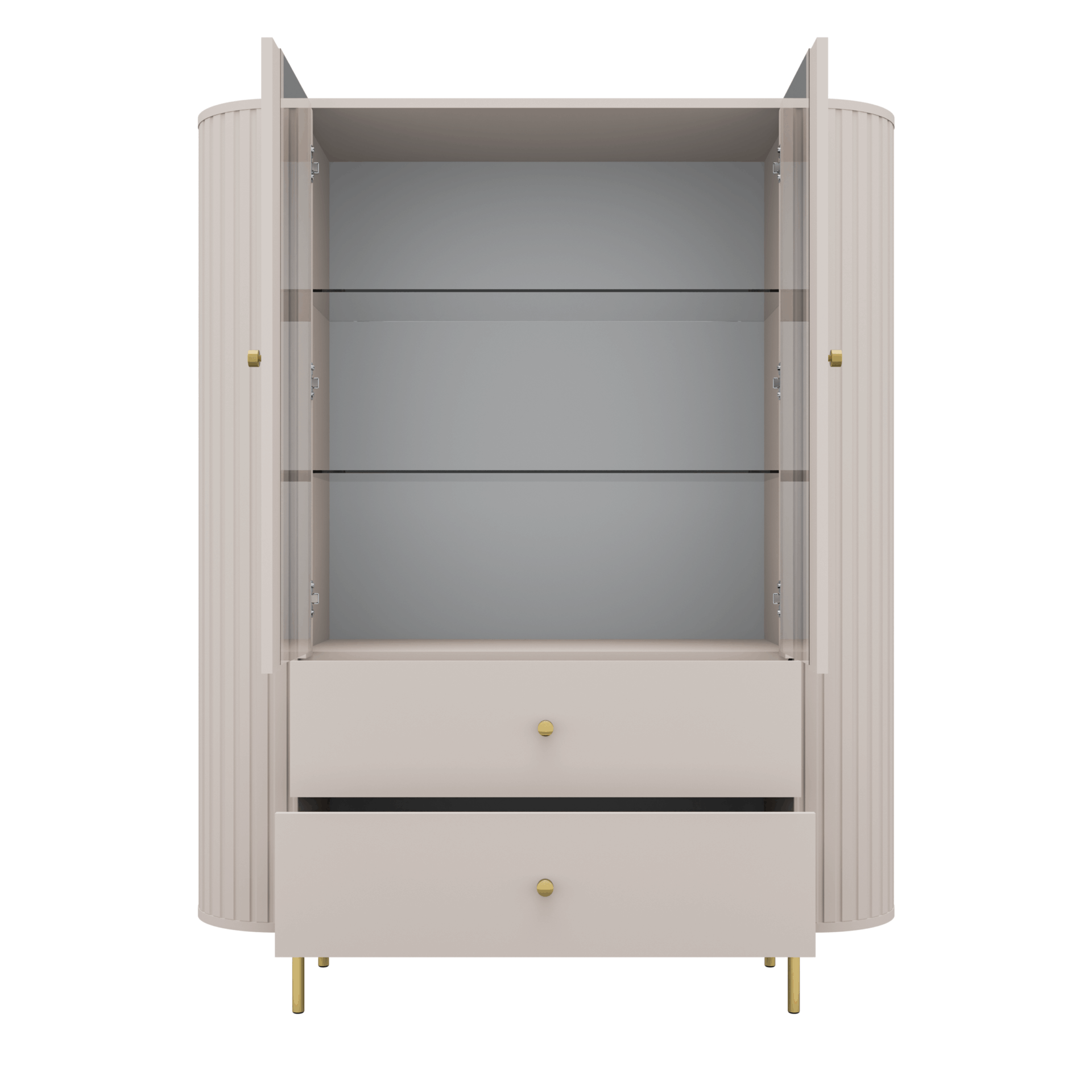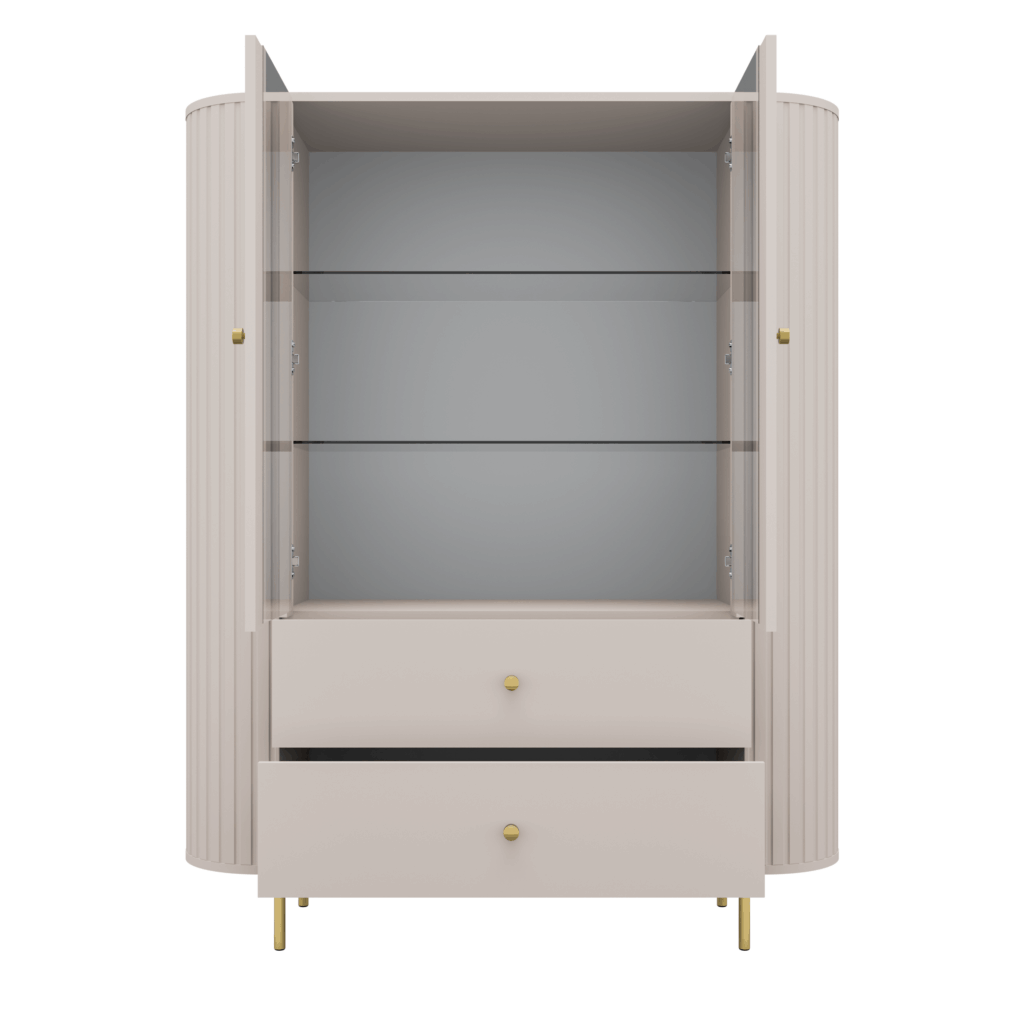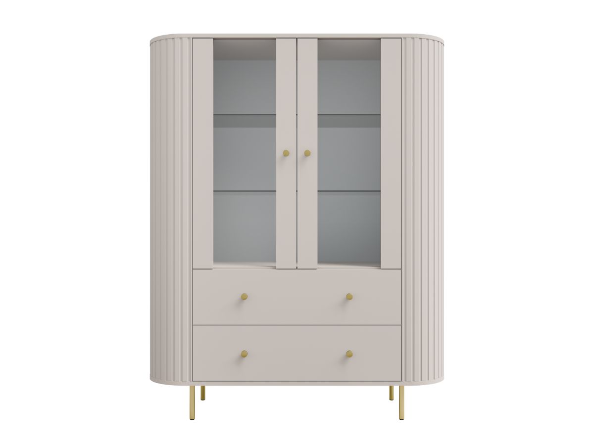 Duża witryna Ovalio beż piaskowy z 2 szklanymi frontami, 2 szufladami i szklanymi półkami to elegancki oraz funkcjonalny mebel, który wprowadza do wnętrza styl, porządek i wyjątkową ekspozycję dekoracji.