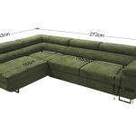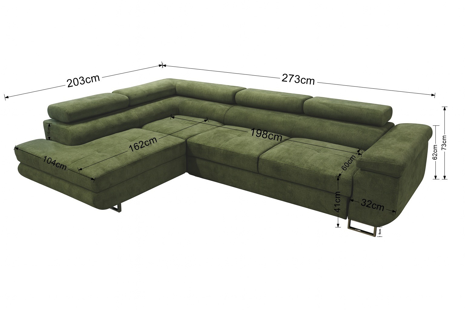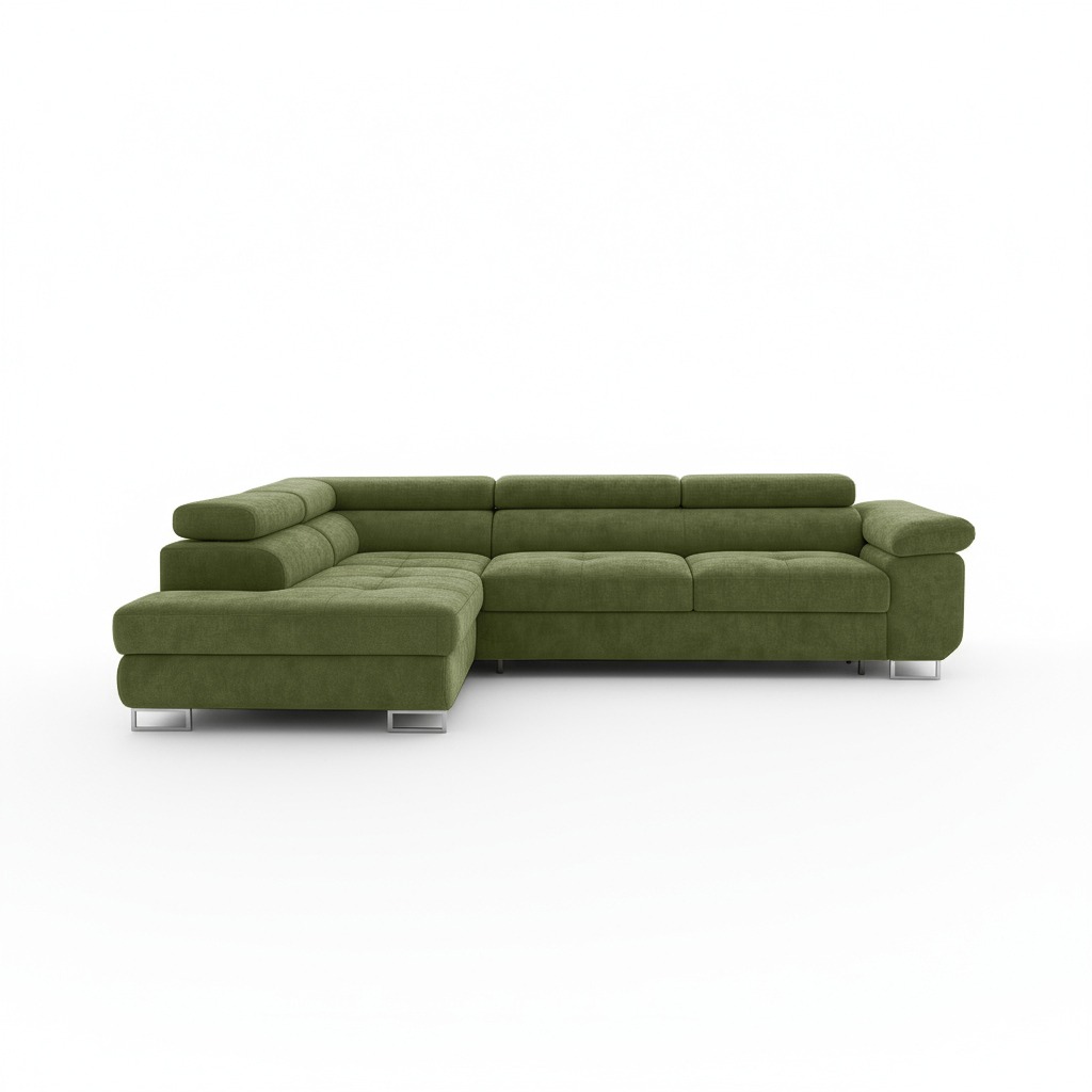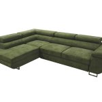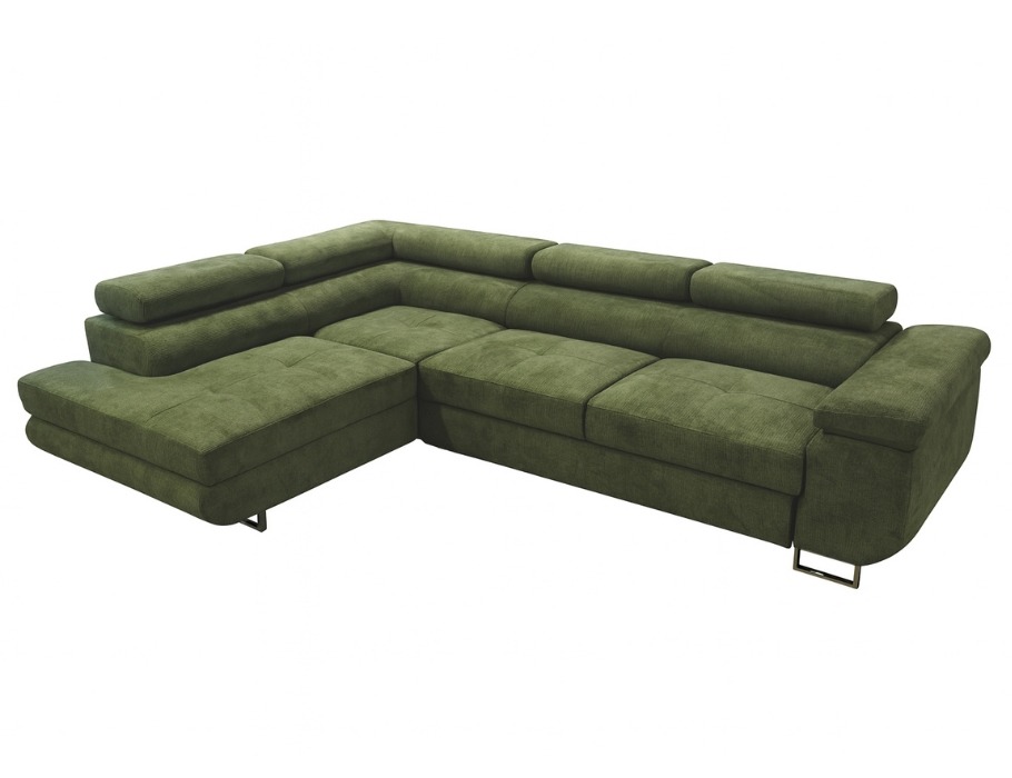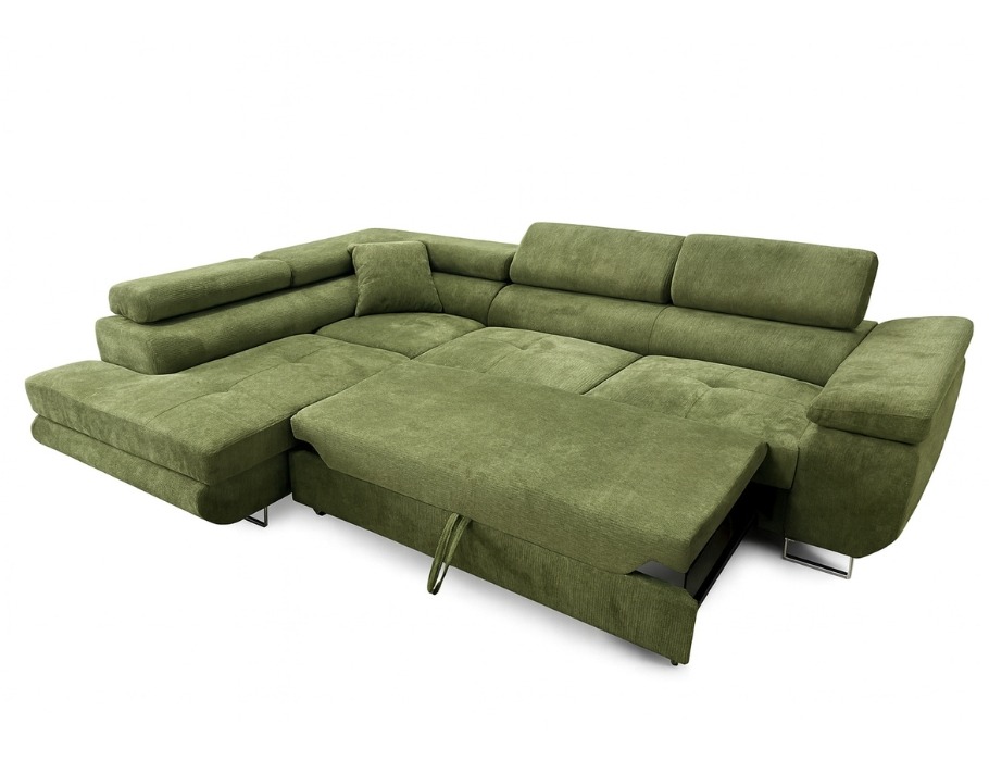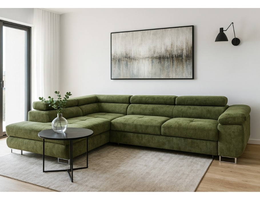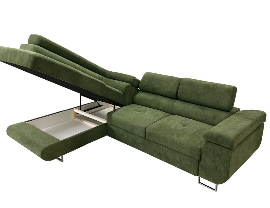 Mebel ma praktyczny układ w kształcie litery L. Wspiera się na wysokich, chromowanych nóżkach, które dodają konstrukcji wizualnej lekkości. Głęboki odcień khaki wprowadza do salonu atmosferę spokoju i bliskości natury. Dlatego narożnik doskonale pasuje do wnętrz nowoczesnych, skandynawskich oraz inspirowanych stylem boho. Co ważne, tapicerowany tył pozwala ustawić go w dowolnym miejscu, także na środku pokoju.