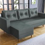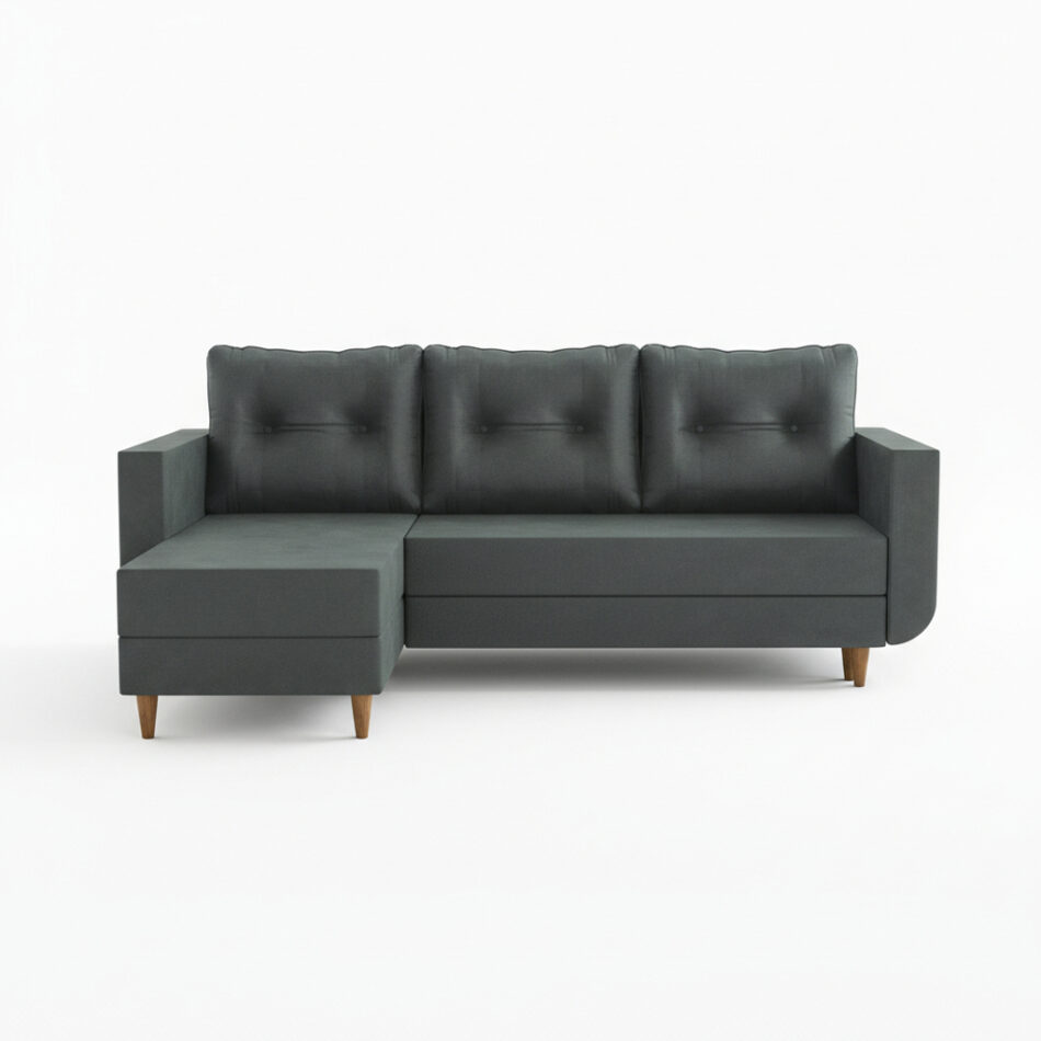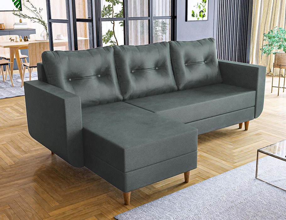 Oto grafitowy narożnik Baldur o klasycznej, eleganckiej formie. Jego ponadczasową bryłę osadzono na wysokich nóżkach z naturalnego drewna bukowego, które dodają konstrukcji wizualnej lekkości.