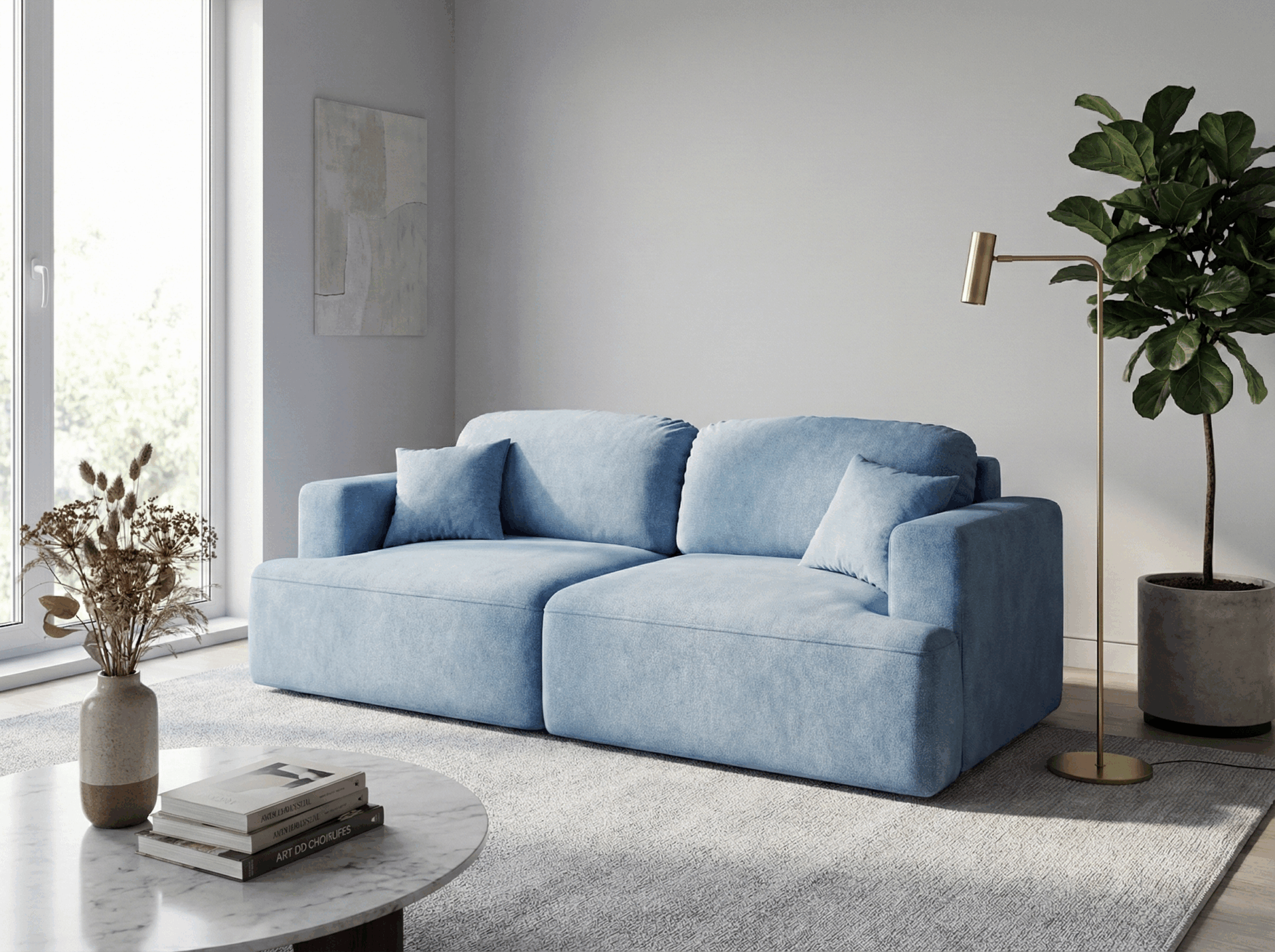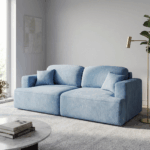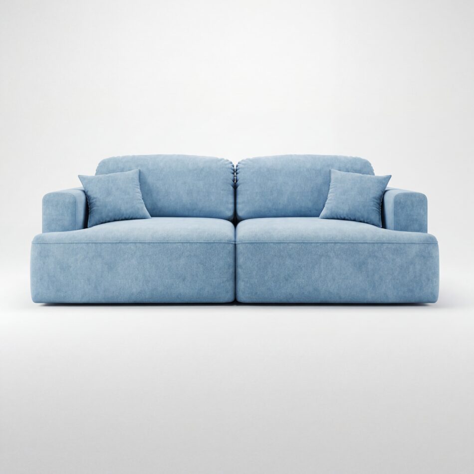 Obicie kanapy wykonano z tkaniny Cloud – przyjemnego w dotyku weluru, który wyróżnia się eleganckim, matowym wykończeniem i subtelną melanżową barwą. To materiał nie tylko piękny, ale również praktyczny – łatwoczyszczący, hydrofobowy oraz odporny na ścieranie, dzięki czemu kanapa długo zachowuje swój atrakcyjny wygląd.