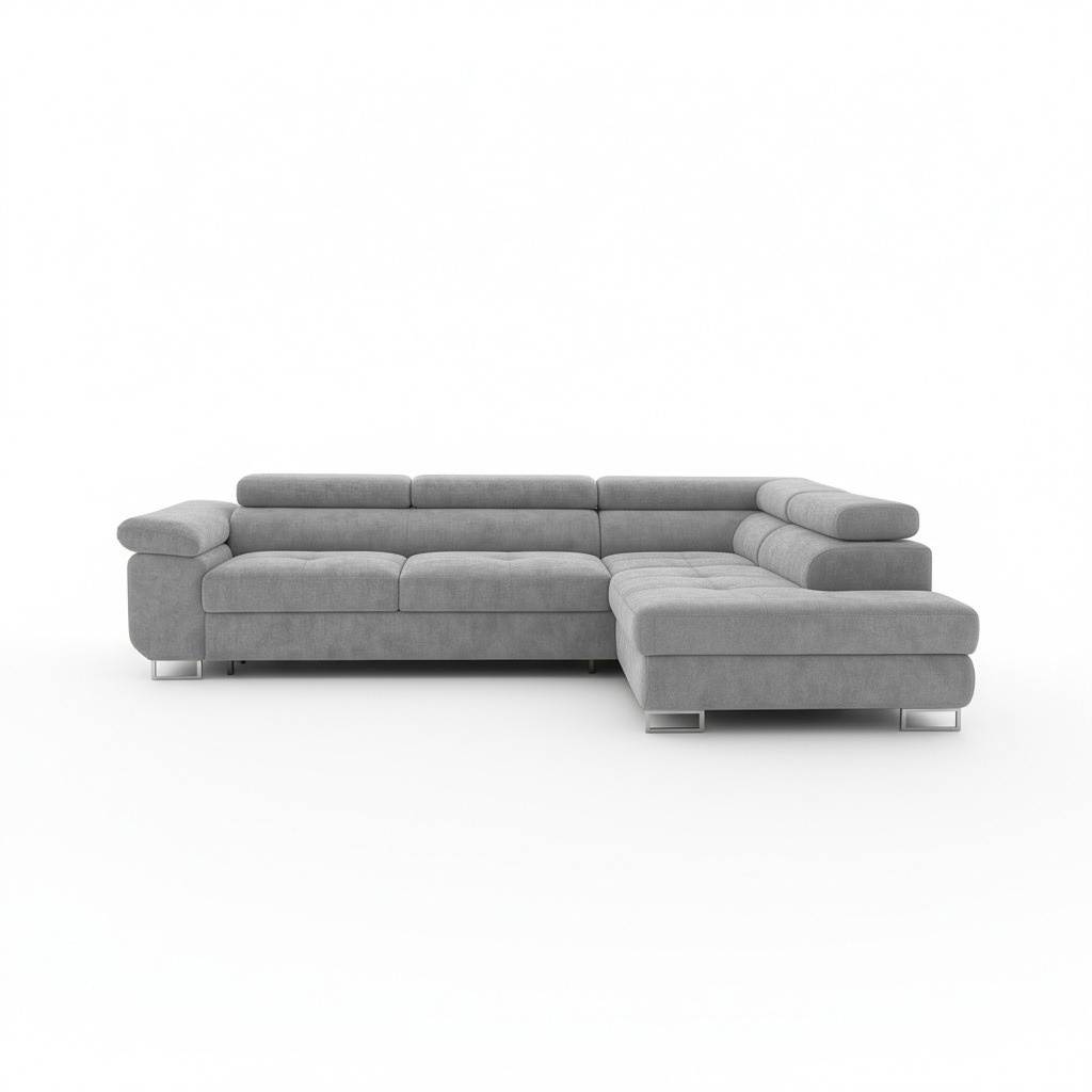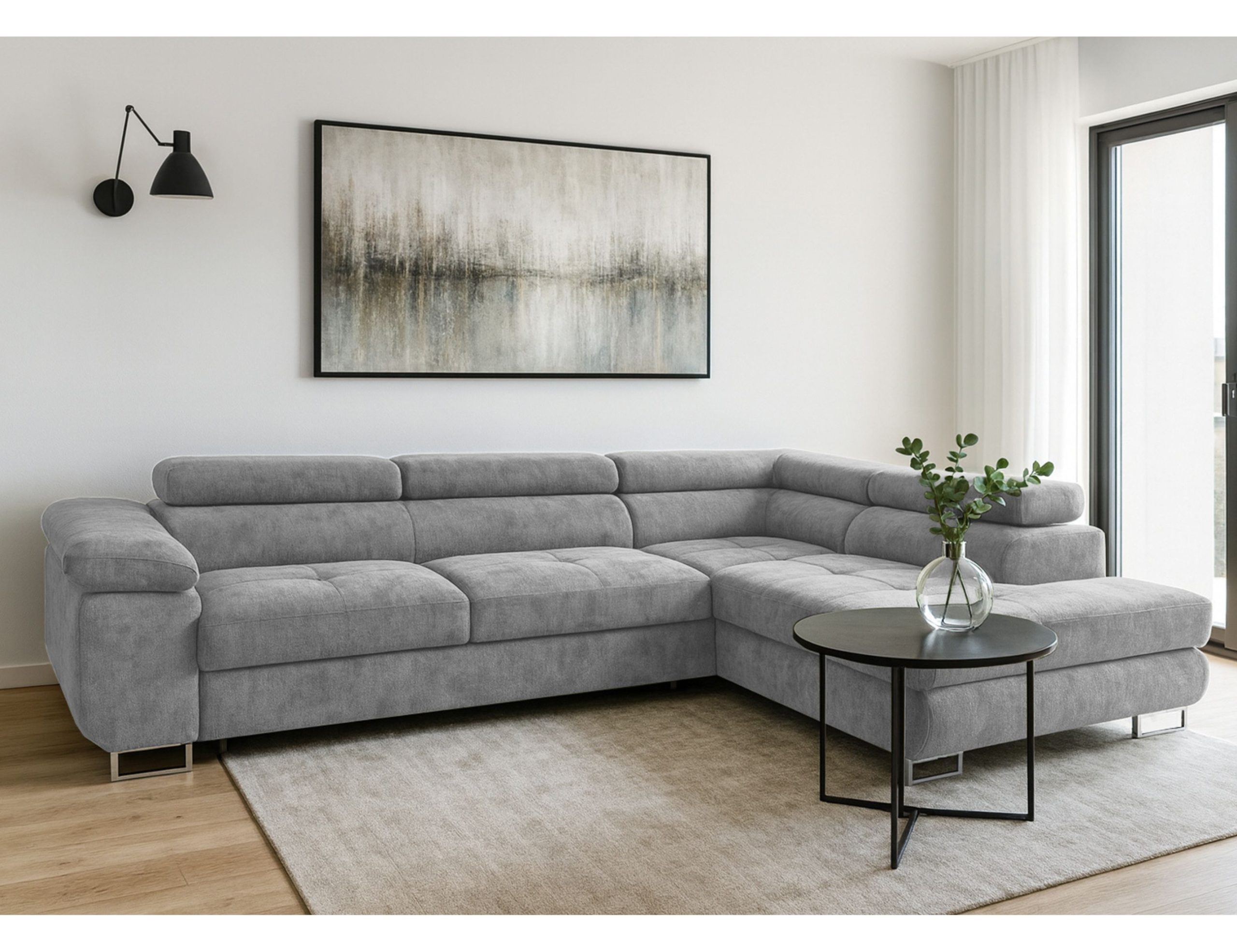 Jego układ w kształcie litery L naturalnie wydziela w pomieszczeniu strefę relaksu. Świetnie sprawdza się zarówno w rogu pokoju, jak i w jego centralnej części. Szlachetny, szary odcień tapicerki nadaje wnętrzu spokoju i klasy. Dlatego stanowi doskonałe tło dla wyrazistych dodatków lub stonowanych aranżacji. Całość osadzono na wysokich, chromowanych nóżkach. W ten sposób bryła zyskuje wizualną lekkość, a utrzymanie czystości pod meblem jest niezwykle proste.