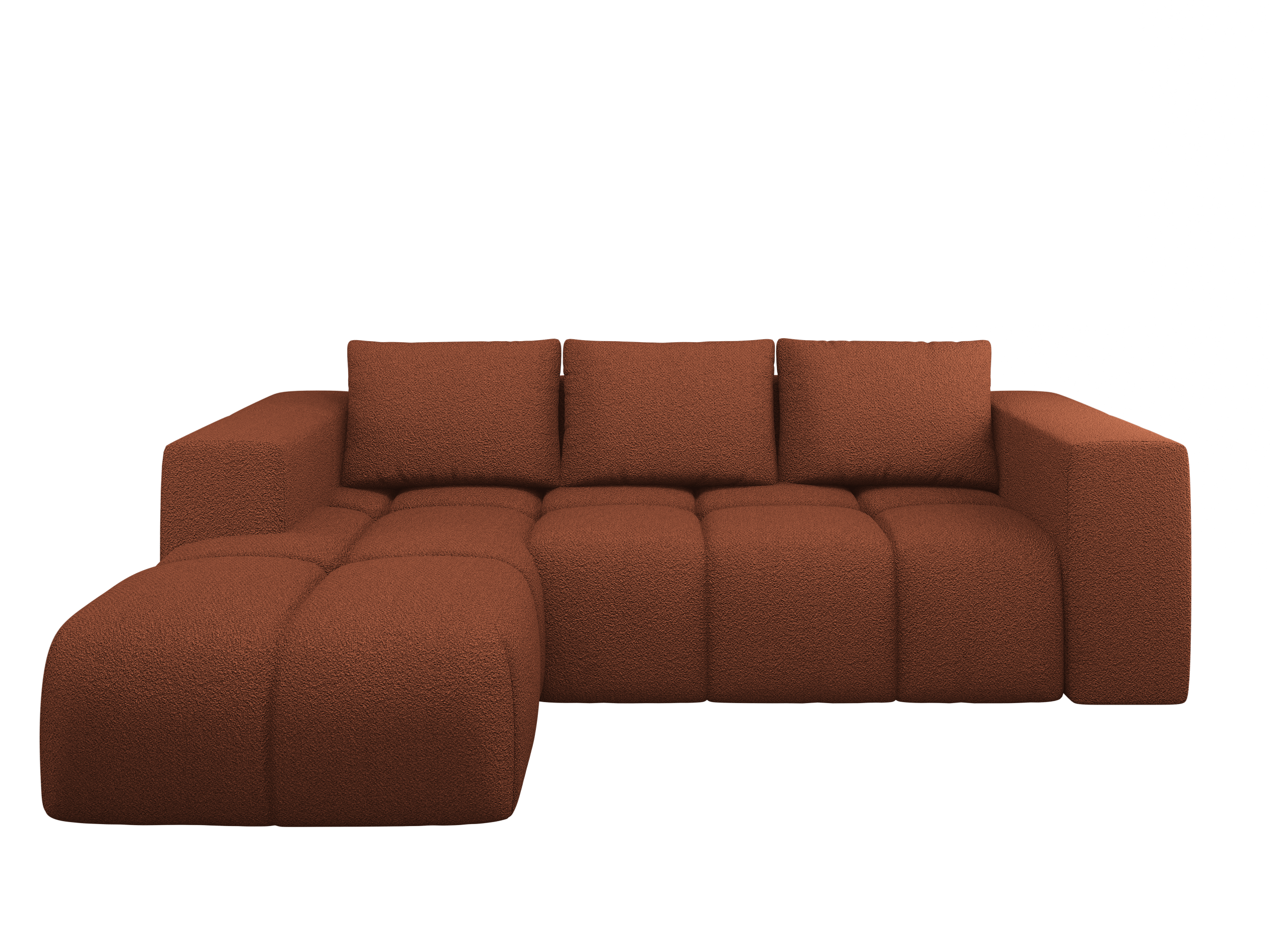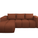 Jego kształt w literze L naturalnie organizuje przestrzeń wypoczynkową. Głęboki miedziany odcień sprawia, że wnętrze staje się bardziej wyraziste i pełne energii. Kolor ten doskonale komponuje się z naturalnym drewnem, zielenią roślin i metalowymi akcentami. Co ważne, tapicerowany tył mebla pozwala ustawić go w dowolnym miejscu salonu. Dzięki temu narożnik prezentuje się znakomicie nawet na środku otwartej przestrzeni.