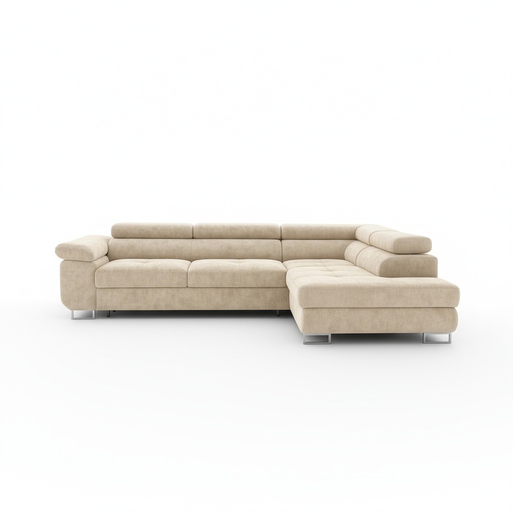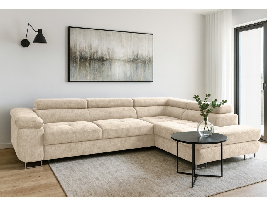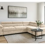 Mebel zaskakuje także swoją funkcjonalnością. W razie potrzeby można go łatwo zamienić w wygodne łóżko dla gości. Rozkładanie za pomocą automatu Delfin jest szybkie i nie wymaga wysiłku. Z kolei pojemny pojemnik na pościel ukryty w otomanie pomaga utrzymać porządek w salonie. Tkanina Aragon o strukturze szenilowej jest wyjątkowo praktyczna. Jej hydrofobowe właściwości utrudniają wchłanianie rozlanych płynów. Jest również przyjazna zwierzętom i łatwa w czyszczeniu, więc beżowe obicie pozostaje piękne na długo.