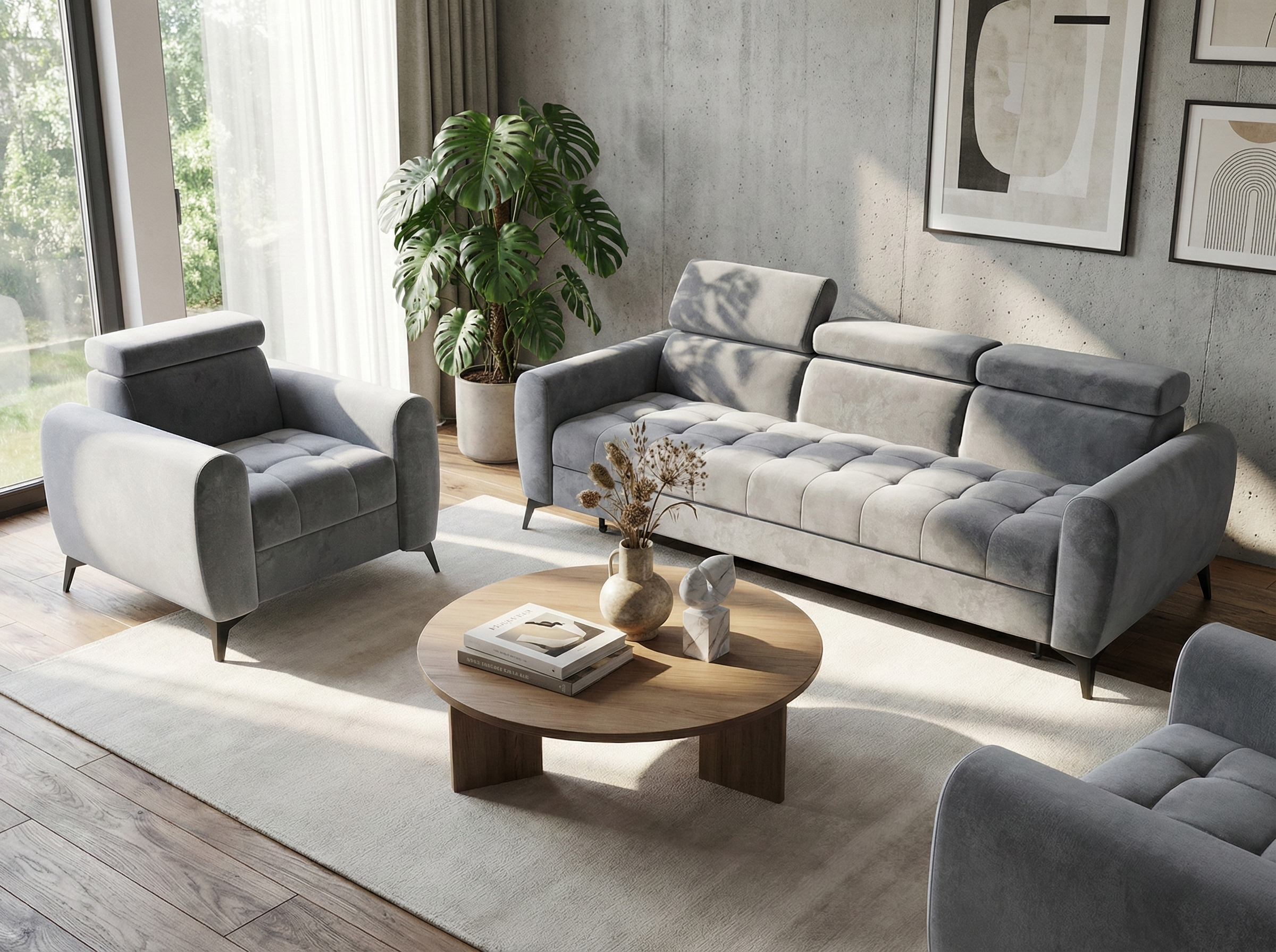 Regulowane zagłówki w kanapie i fotelach zapewniają indywidualny komfort dla każdej osoby.