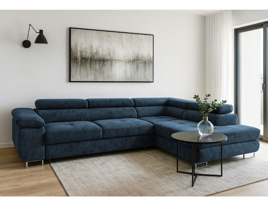 Jego przemyślany kształt w formie litery L z łatwością wkomponuje się w przestrzeń salonu. W ten sposób stworzy naturalne centrum domowego życia. Głęboki, granatowy kolor tapicerki nadaje wnętrzu wyrafinowanego charakteru. Doskonale współgra z dodatkami w odcieniach złota, szarości czy naturalnego drewna. Wysokie, chromowane nóżki dodają całej konstrukcji wizualnej lekkości. Co ważne, tapicerowany tył mebla pozwala na ustawienie go w dowolnym miejscu, nawet na środku pokoju.
