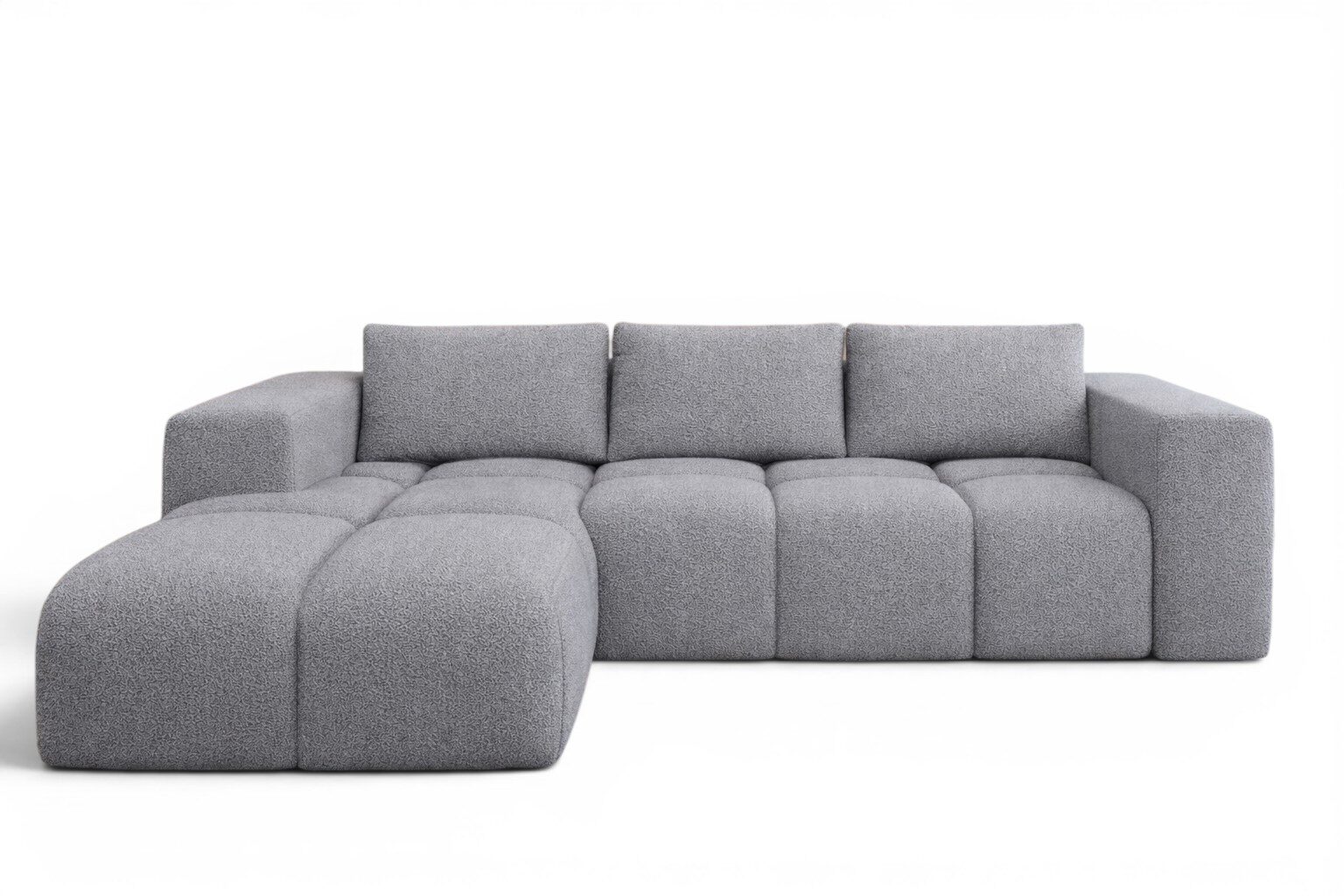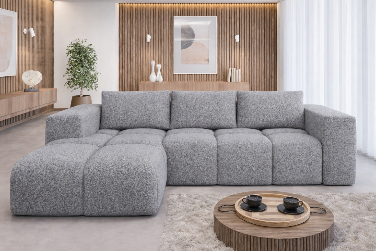 Jego układ w kształcie litery L tworzy idealne miejsce do relaksu i spotkań z bliskimi. Mebel naturalnie wyznacza strefę wypoczynku w salonie. Szlachetny szary kolor tapicerki nadaje wnętrzu elegancji i spokoju. Dlatego narożnik świetnie wpisuje się w aranżacje nowoczesne oraz inspirowane stylem boho. Taka barwa stanowi doskonałą bazę dla kolorowych dodatków.