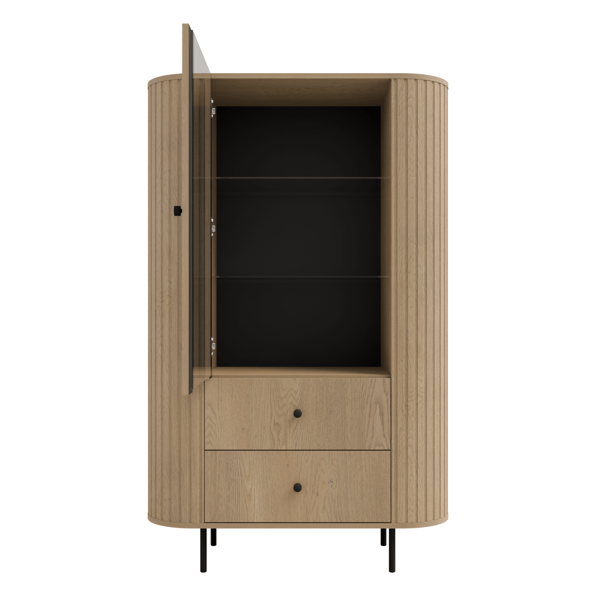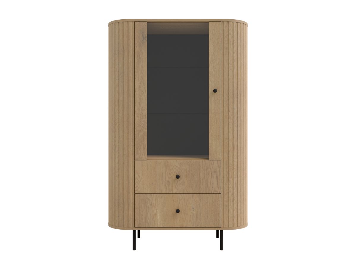 Witryna Ovalio dąb Cremona z 1 szklanym frontem, 2 szufladami i szklanymi półkami to elegancki i funkcjonalny mebel, który wprowadza styl, porządek i wyjątkową ekspozycję dekoracji do każdego wnętrza.